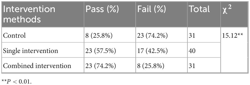 As shown in Table 4, a chi-square test was conducted to assess the differences in the pass rates across three groups: the control group, the single-intervention group, and the combined-intervention group. The results, summarized in Table 4, revealed significant differences in the pass rates among the three groups, χ2(2) = 15.12, p = 0.001. Specifically, the pass rates in both the single-intervention group (57.5%) and combined-intervention group (74.2%) were significantly higher than those in the control group (25.8%). However, no significant difference was observed between the single-intervention group and the combined-intervention group.