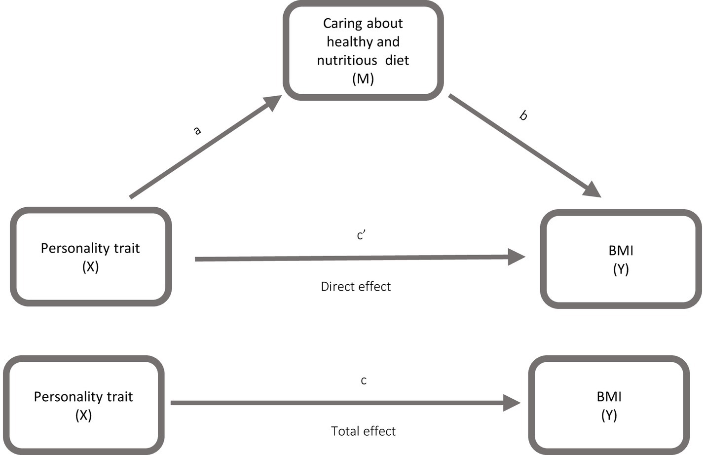 Figure 1. Model illustrating the mediating role of caring about a healthy and nutritious diet (M) in the association between personality traits (X) and body mass index (Y).