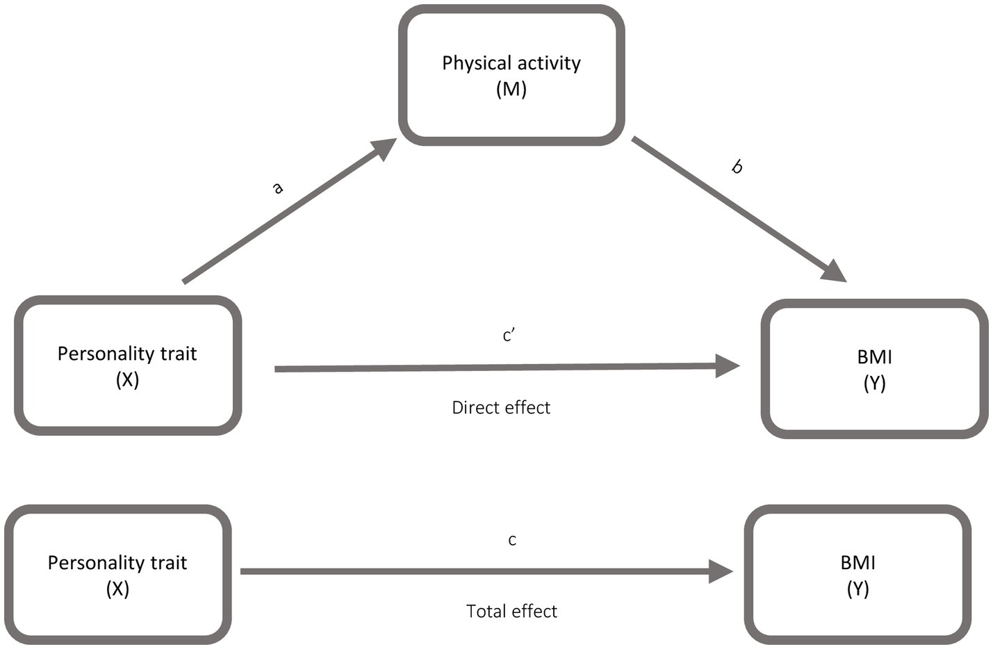 Figure 2. Model illustrating the mediating role of physical activity (M) in the association between personality traits (X) and body mass index (Y).