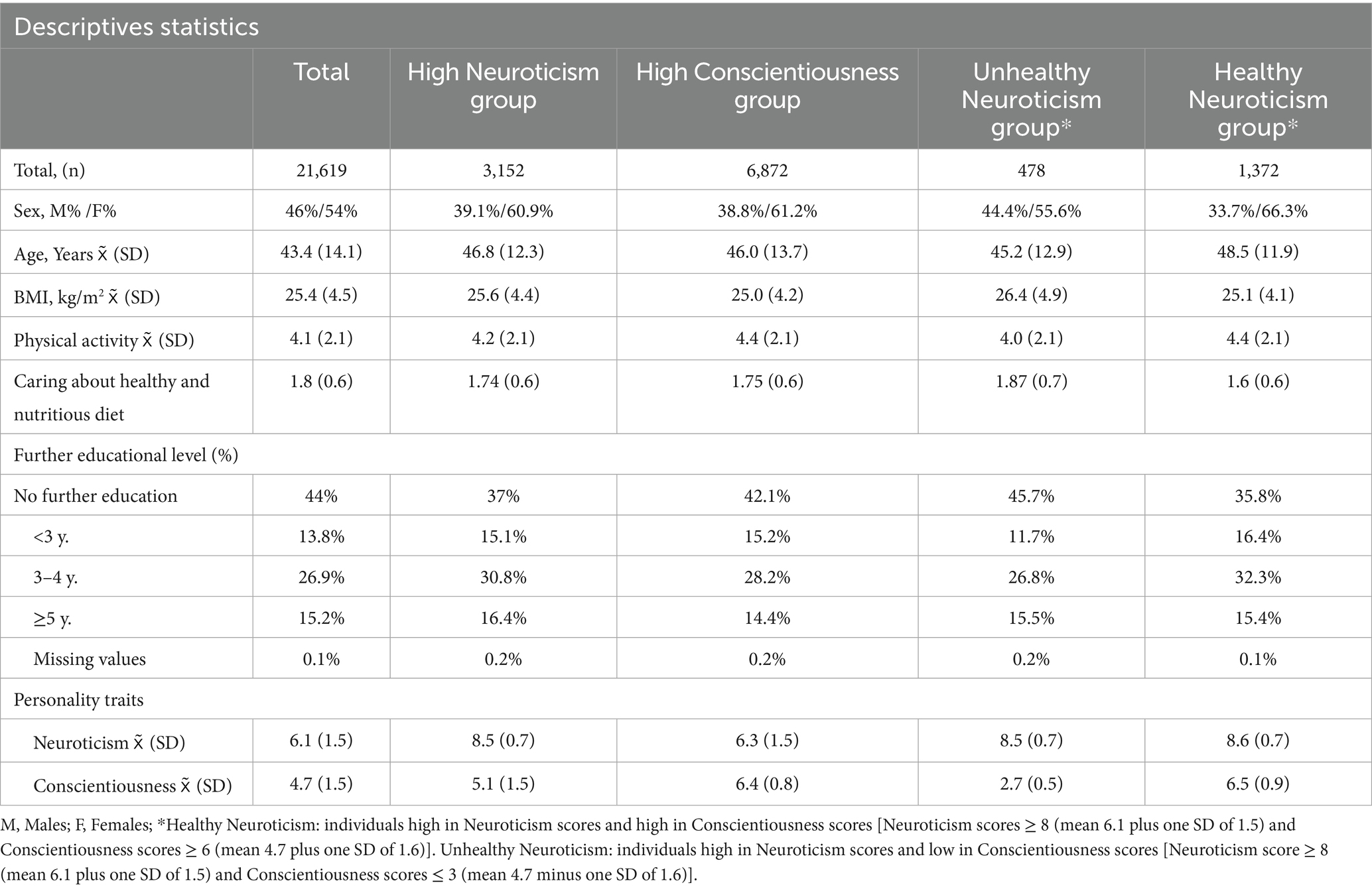The literature presents conflicting findings regarding the association between Neuroticism and health-related outcomes. While high Neuroticism is often associated with adverse health behaviours, some studies suggest it may also be associated with reduced mortality risk, and lower levels of inflammation markers, potentially mediated by increased physical activity (Weiss and Costa, 2005; Graham et al., 2018). These contrasting results of Neuroticism have led to the theory of Healthy Neuroticism (Friedman, 2000). Healthy Neuroticism is not defined consistently across studies, some researchers have investigated Healthy Neuroticism as the interaction of socioeconomics factors and sex on Neuroticism (Hagger-Johnson et al., 2012; Graham et al., 2020), whereas the majority of studies investigate the interaction of Neuroticism and Conscientiousness. Studies indicate that individuals with high Neuroticism and low Conscientiousness, are more likely to engage in undesirable health behaviours, such as smoking, exhibit higher levels of the inflammation marker interleukin 6 (IL-6), which may be driven by these undesirable behaviours, compared to individuals who score high on both Neuroticism and Conscientiousness (Healthy Neuroticism) (Weston and Jackson, 2014; Turiano et al., 2013). A series of three separate papers investigated the impact of Healthy Neuroticism on longevity, chronic diseases, and health behaviours (Graham et al., 2020; Turiano et al., 2020; Weston et al., 2020). One of the papers reported that high Conscientiousness may protect against the risk of smoking among individuals with high Neuroticism. It also found that individuals high in Neuroticism and low in Conscientiousness were more likely to be physically inactive (Graham et al., 2020). However, research on Healthy Neuroticism is still sparse, not least in the field of health behaviours, such as physical activity and dietary choices.