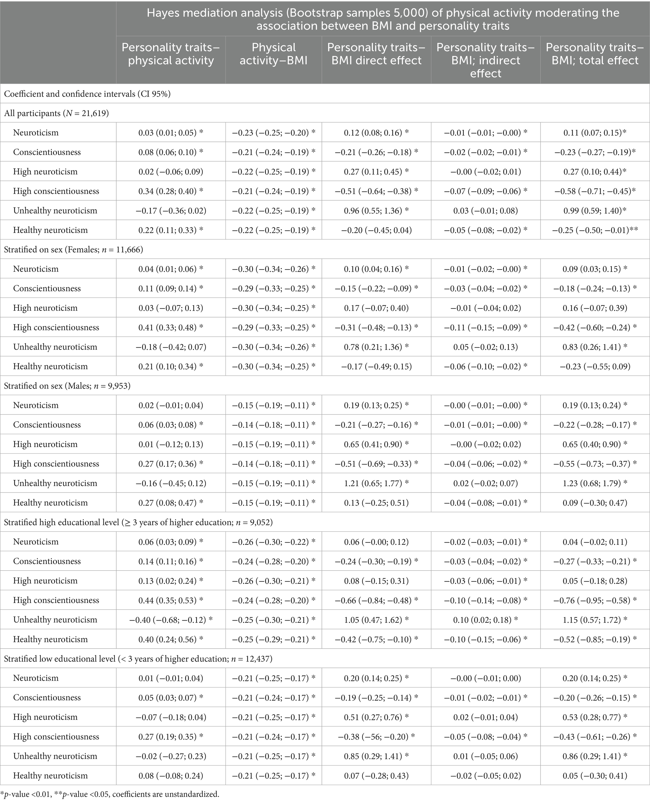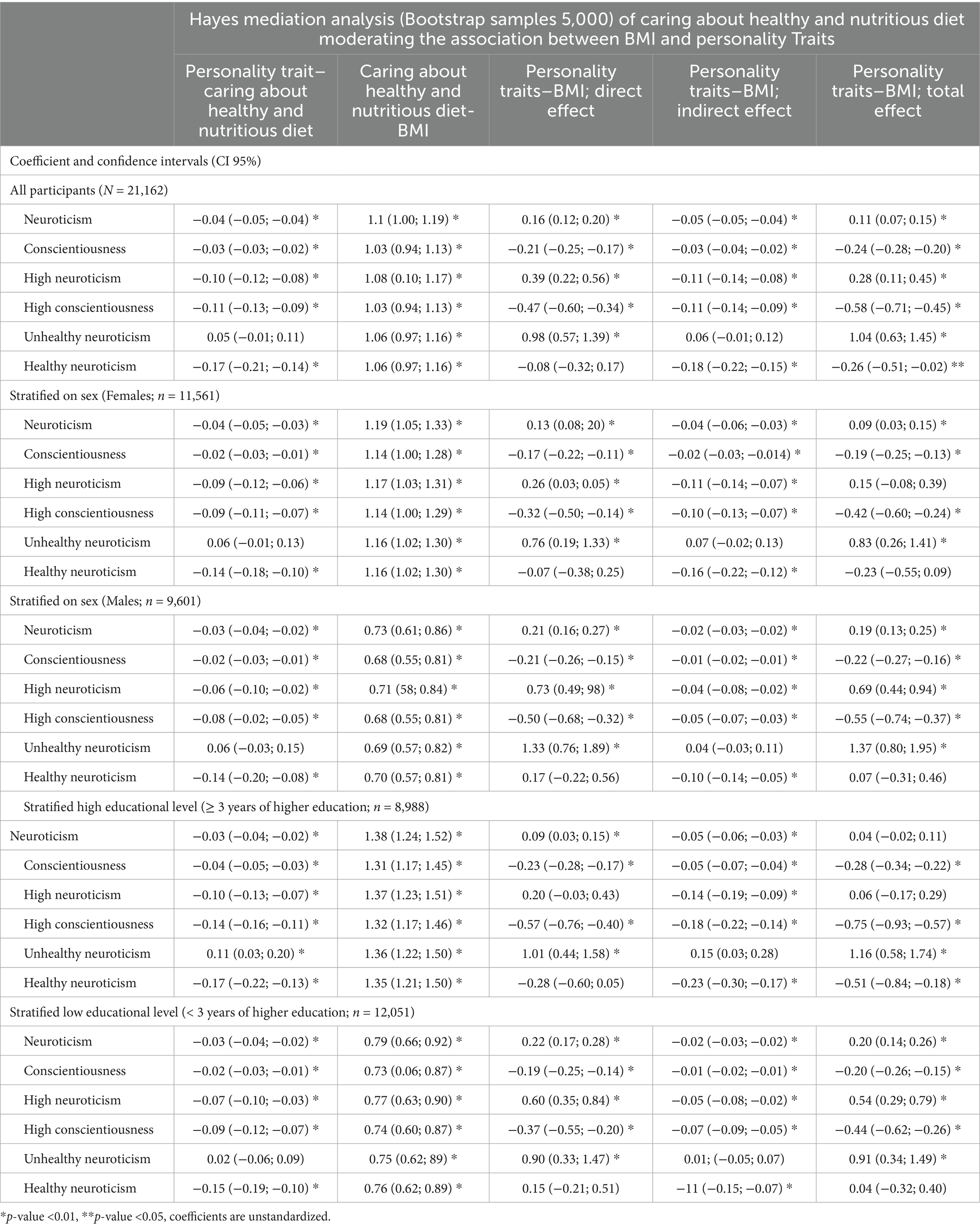 Prior research has indicated that associations between personality traits and BMI differ between men and women in both strength and direction (Wimmelmann et al., 2018). Thus, stratified analyses by sex were conducted. The analyses were repeated for males and females separately. Stratified analyses were conducted for educational level, as education may moderate the strength or direction of the associations. Low educational level was defined as <3 years of higher education, and high educational level, defined as ≥3 years of higher education. Similar to the non-stratified analysis, mediation analyses were subsequently performed for each of the independent variables, using BMI as outcome variable and physical activity and if the participant cared about having a healthy and nutritious diet as mediators.