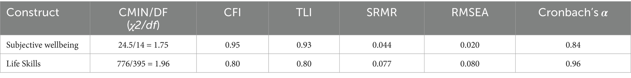 Confirmatory Factor Analysis (CFA) results for the Subjective Wellbeing Scale were as follows: CMIN/DF (χ2/df) = 1.75, CFI = 0.95, TLI = 0.93, SRMR = 0.044, RMSEA = 0.020. The Cronbach’s Alpha (α) internal consistency coefficient was 0.84. For the Life Skills Scale, the CFA results were: CMIN/DF (χ2/df) = 1.96, CFI = 0.80, TLI = 0.80, SRMR = 0.077, RMSEA = 0.080. The Cronbach’s Alpha (α) internal consistency coefficient was calculated as 0.96.