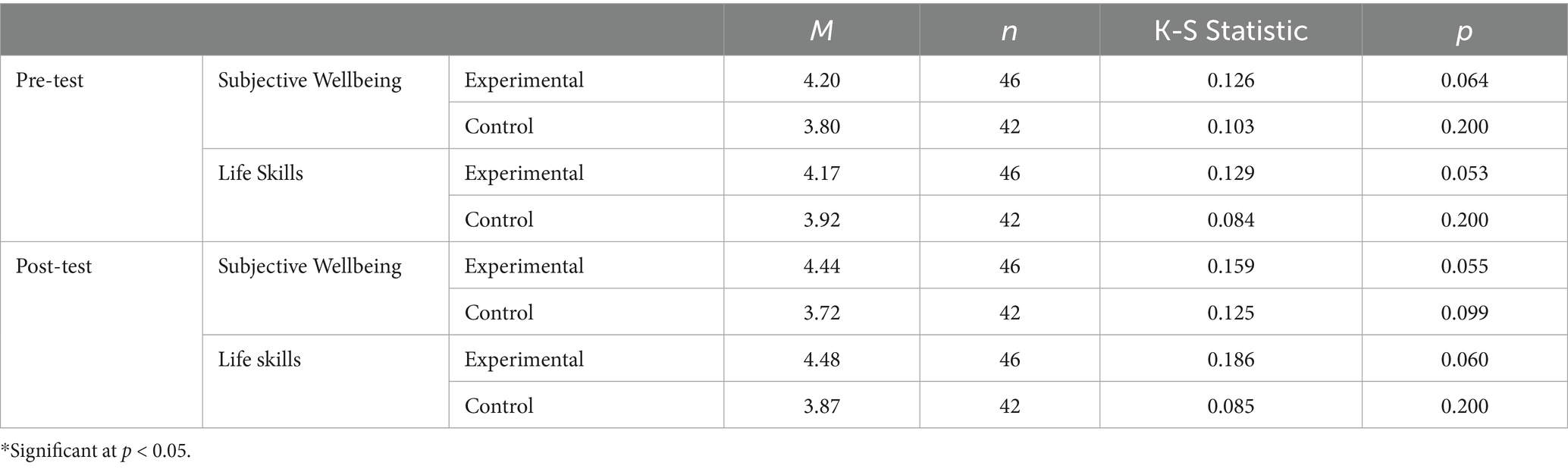 To satisfy the requirements of a two-way mixed-design ANOVA (2 × 2), the assumption of normal distribution must be met across all groups and measurements within the analysis. This assumption is verified when Kolmogorov–Smirnov (K-S) test results yield p-values exceeding 0.05 (Greenland et al., 2016). As shown in Table 2, all distributions demonstrated p-values above this threshold, confirming normality across all subgroups and measurements. With normality established, we proceeded with the two-way mixed ANOVA to evaluate the camp program’s impact on the experimental group. The analytical framework employed a two-way design, incorporating two independent variables: group (experimental versus control) and time (pre-test versus post-test). This methodological approach facilitates concurrent examination of between-group variations, within-group temporal changes, and their interaction effects (Jansen et al., 2005). The two-way mixed ANOVA methodology enables comprehensive assessment of group differences, longitudinal changes, and group-by-time interactions while controlling error rates and maintaining statistical precision within a 95% confidence interval (Fidler and Thompson, 2001). In addition to ANOVA, we employed simple linear regression analysis to investigate the relationship between life skills and subjective wellbeing. Statistical analyses were conducted utilizing IBM SPSS Statistics for Windows, Version 25.0 (IBM Corp., Armonk, N.Y., USA) (Table 3).