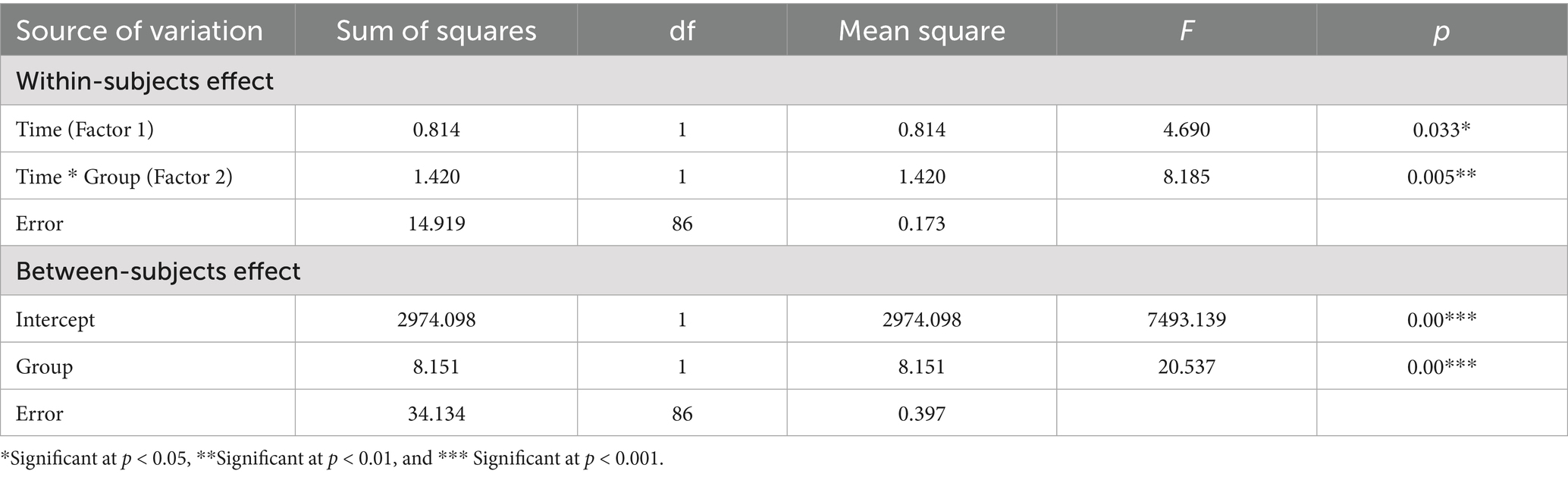 To test our primary experimental hypothesis (H4), a two-way mixed-design ANOVA was utilized to investigate the intervention’s impact. The analysis indicated a statistically significant main effect for time, F(1, 86) = 4.690, p = 0.033, and a significant interaction effect between Time and Group, F(1, 86) = 8.185, p = 0.005. Additionally, a significant main effect for group was identified, F(1, 86) = 20.537, p < 0.001.
