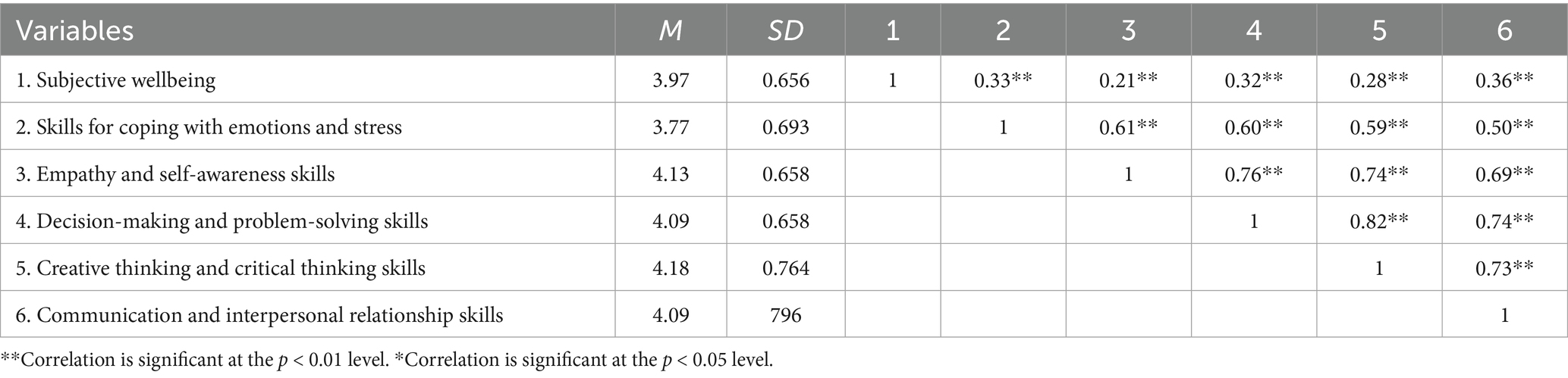 In addition to these essential life skills, subjective wellbeing is a vital psychological concept that involves how individuals assess and emotionally experience life satisfaction, emotional conditions, and overall quality of life (Baker et al., 2005). Among students, subjective wellbeing is shaped by factors such as academic stress, social connections, emotional abilities, and achievement of personal goals. A wealth of research indicates that improving life skills can have a beneficial effect on wellbeing, both by directly enhancing emotional coping mechanisms and indirectly by improving interpersonal relationships and self-efficacy (Schliep et al., 2021; Saw et al., 2016; Chen and Kee, 2008).