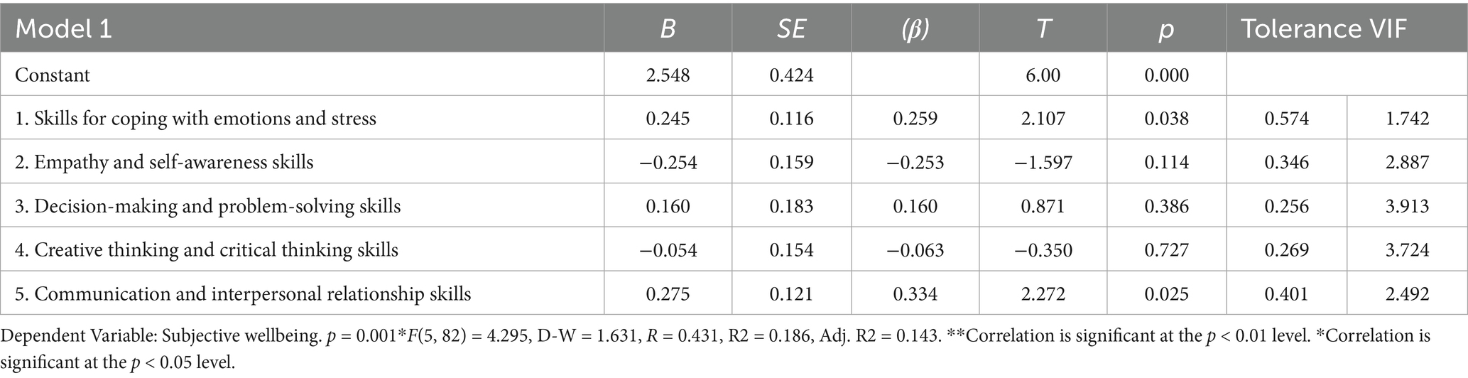 Multiple linear regression analysis was conducted to evaluate how well the five dimensions of life skills could predict subjective wellbeing. The subdimensions of the Life Skills Scale served as independent variables, while subjective wellbeing was the dependent variable. The analysis met all assumptions, indicating no issues with multicollinearity (all tolerances > 0.25, VIF < 4.0) or independence of errors (Durbin-Watson = 1.631). The overall regression model was statistically significant, F(5, 82) = 4.295, p = 0.001, explaining 18.6% of the variance in subjective wellbeing (Adjusted R2 = 0.143). A closer look at the individual predictors (Table 5) revealed that coping skills with emotions and stress (β = 0.259, p = 0.038) and Communication and Interpersonal Relationship Skills (β = 0.334, p = 0.025) were significant positive predictors. The other three dimensions— empathy and self-awareness skills, decision-making and problem-solving skills, and creative and critical thinking skills —did not reach statistical significance in the model.