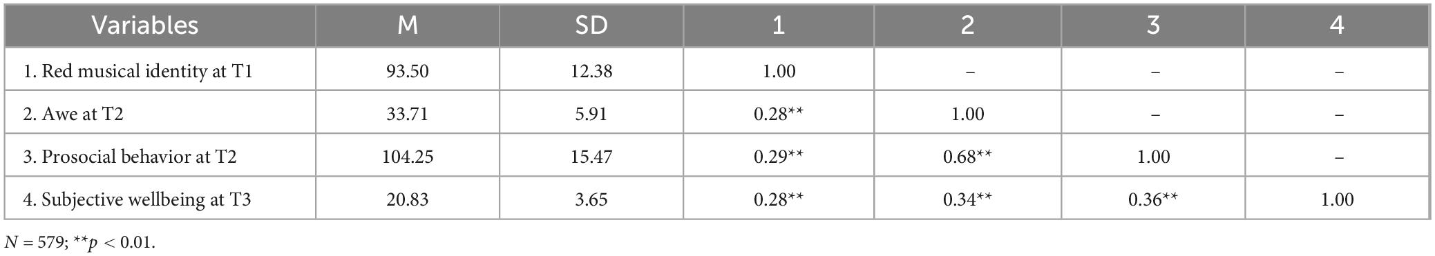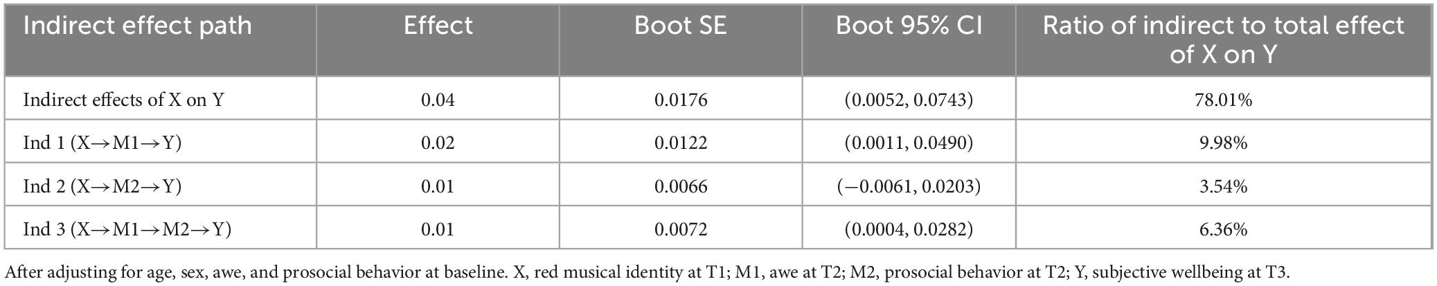 Results: The results showed that red musical identity at Time 1, awe at Time 2, prosocial behavior at Time 2, and subjective wellbeing at Time 3 were significantly correlated, and all were positively associated with subjective wellbeing at Time 3. However, the direct effect of red musical identity at Time 1 on prosocial behavior at Time 2 was not significant. After adjusting for age, sex, awe, and prosocial behavior at baseline, red musical identity at Time 1 positively predicted subjective wellbeing at Time 3. Furthermore, awe at Time 2 mediated the path from red musical identity at Time 1 to subjective wellbeing at Time 3. In addition, a sequential indirect pathway was supported: red musical identity at Time 1 showed indirect effects on subjective wellbeing at Time 3 successively via the awe at Time 2 and prosocial behavior at Time 2.