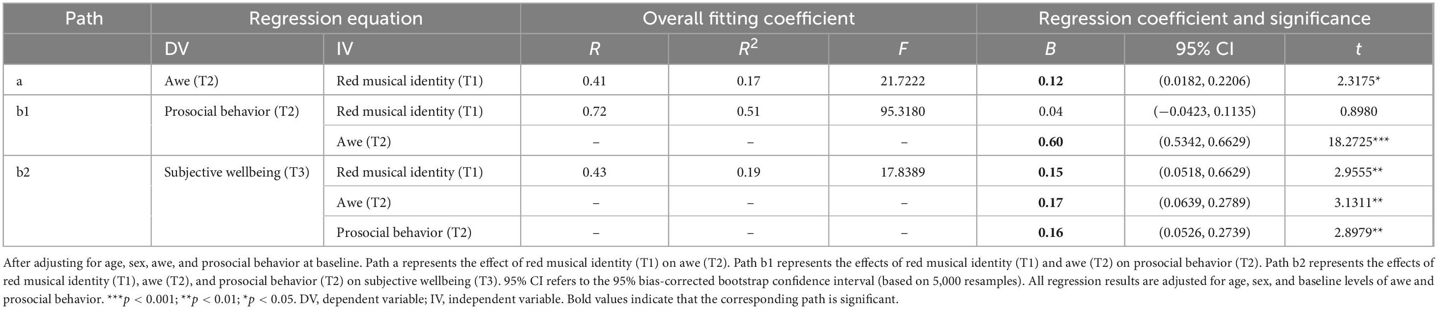 Table 2 presents the regression analysis results. After controlling for sex, awe, and prosocial behavior at baseline, red musical identity at T1 significantly positively predicted subjective wellbeing at T3 (β = 0.19, p < 0.001). After adding the two mediating variables, red musical identity at T1 significantly positively predicted awe at T2 (β = 0.12, p < 0.05); awe at T2 significantly positively predicted prosocial behavior at T2 (β = 0.60, p < 0.001) and subjective wellbeing at T3 (β = 0.17, p < 0.01); prosocial behavior at T2 positively predicted subjective wellbeing at T3 (β = 0.16, p < 0.01); and red musical identity at T1 still significantly predicted subjective wellbeing at T3 (β = 0.15, p < 0.01).