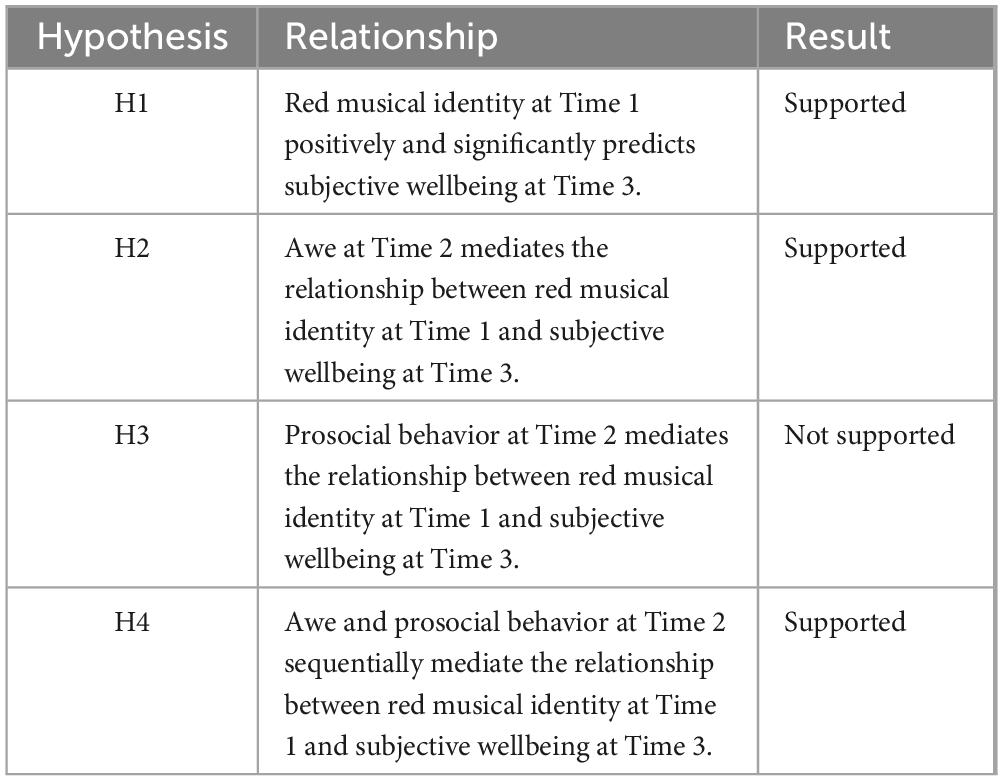 Table 3 presents the mediating effects based on the bootstrapping method. The bootstrap confidence intervals of the above mediation effects did not contain a value of zero, indicating that the three mediation effects reached significance. Specifically, three paths produced mediating effects: the indirect effect 1 (0.02) of red musical identity at T1→awe at T2→subjective wellbeing at T3 path; the indirect effect 2 (0.01) of red musical identity at T1→prosocial behavior at T2→subjective wellbeing at T3 path; and the indirect effect 3 (0.01) of red musical identity at T1→awe at T2→prosocial behavior at T2→subjective wellbeing at T3 path. Table 3 shows that the three indirect effects accounted for 9.98%, 3.54%, and 6.36% of the total effects, respectively. Figure 1 presents the two-mediator sequential model. To provide a concise overview of all hypothesis testing results, Table 4 summarizes whether each proposed hypothesis was supported.