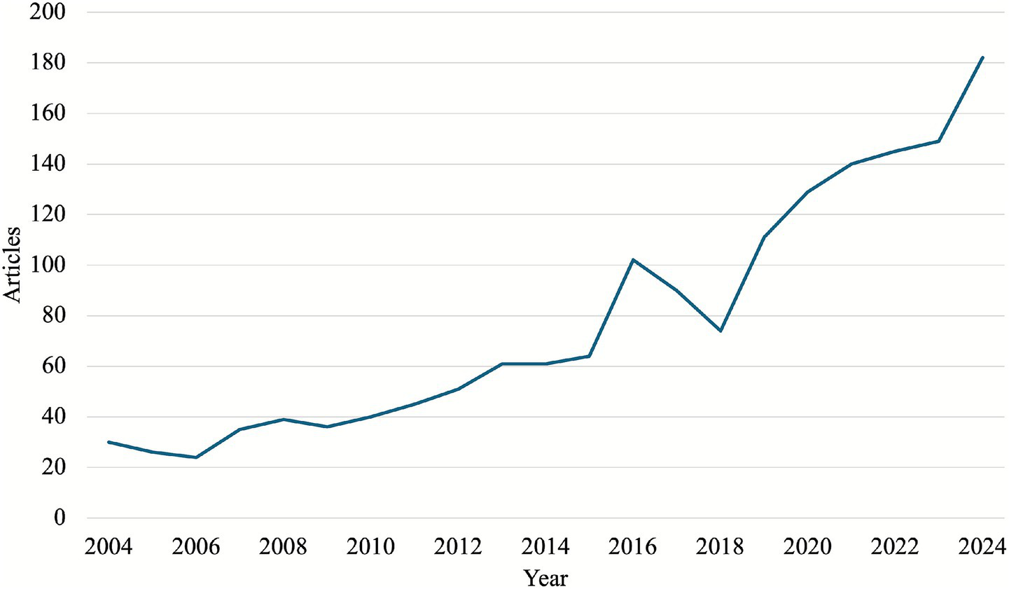 The Summary Information section provides essential statistics on the examined dataset. Table 1 highlights 1,634 items published between 2004 and 2024 across 937 sources, involving 5,064 authors. A co-author ratio of 3.61 and an international collaboration rate of 6.18% were recorded. Keywords Plus (6,565) and author’s keywords (3,763) show diverse research focus, with 14.17 average citations per document. A 9.43% annual growth rate indicates rising interest and development in music therapy in education. Additionally,
