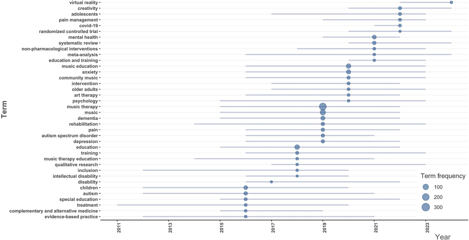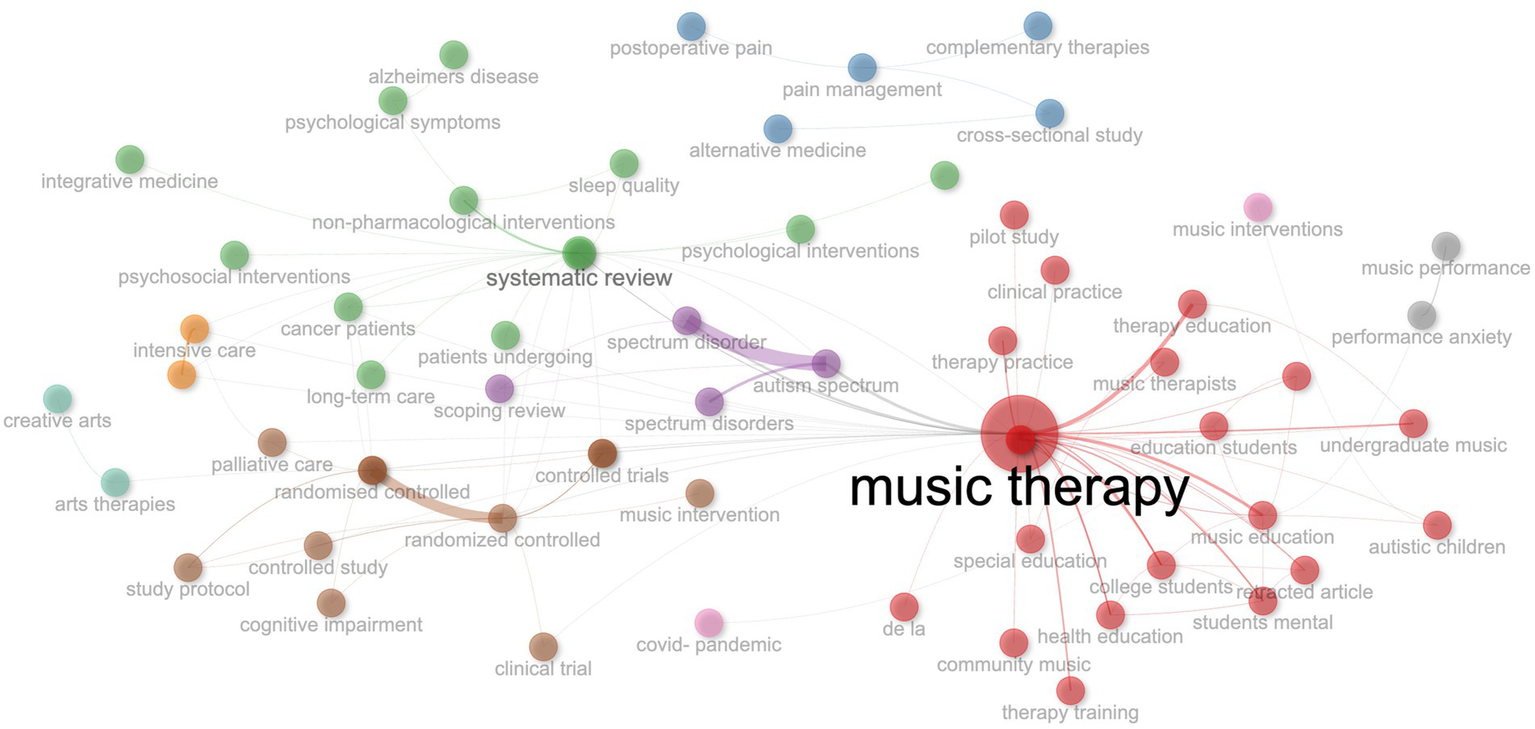 (1) Identifying and visualizing the evolution of key themes and methodologies in music therapy within educational settings over the past two decades.