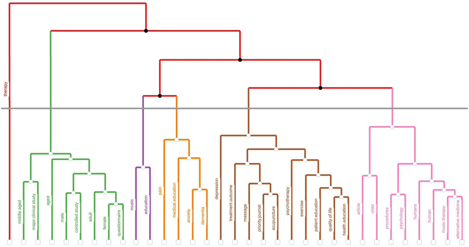The annual growth in Music Therapy in Education research publications (shown in Figure 2) demonstrates a consistent upward trajectory, increasing from 30 articles in 2004 to 182 in 2024. The significant acceleration in publication volume post-2015 likely reflects enhanced institutional support and a growing acknowledgment of music therapy’s impact on student outcomes.