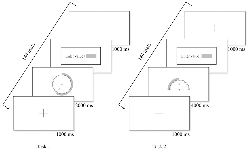 Among the 30 participants, 15 performed Task 1 (144 trials) first, followed by Task 2 (144 trials), while the other 15 followed the reverse order. Each graphic form had nine combinations, each combination appearing four times randomly. To avoid fatigue, the participants took a 3-min break before proceeding to the next task. Each participant took ~40 min to complete both tasks.