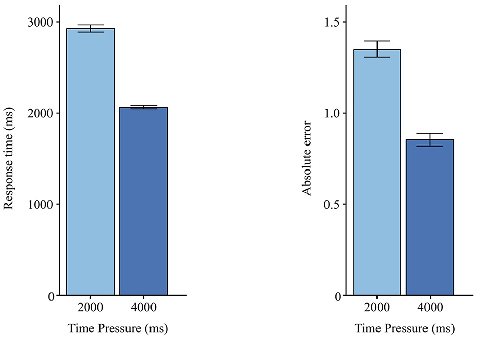 Across measures, a significant main effect of Time Pressure was observed for RT, F(1, 29) = 7.31, p= < 0.05 (Table 3), and for AE, F(1, 29) = 29.20, p < 0.001 (Table 4). Figure 6 illustrates that, compared to 2,000 ms, participants responded faster under 4,000 ms (ΔRT = 867 ms) and made fewer errors (ΔAE = 0.498).