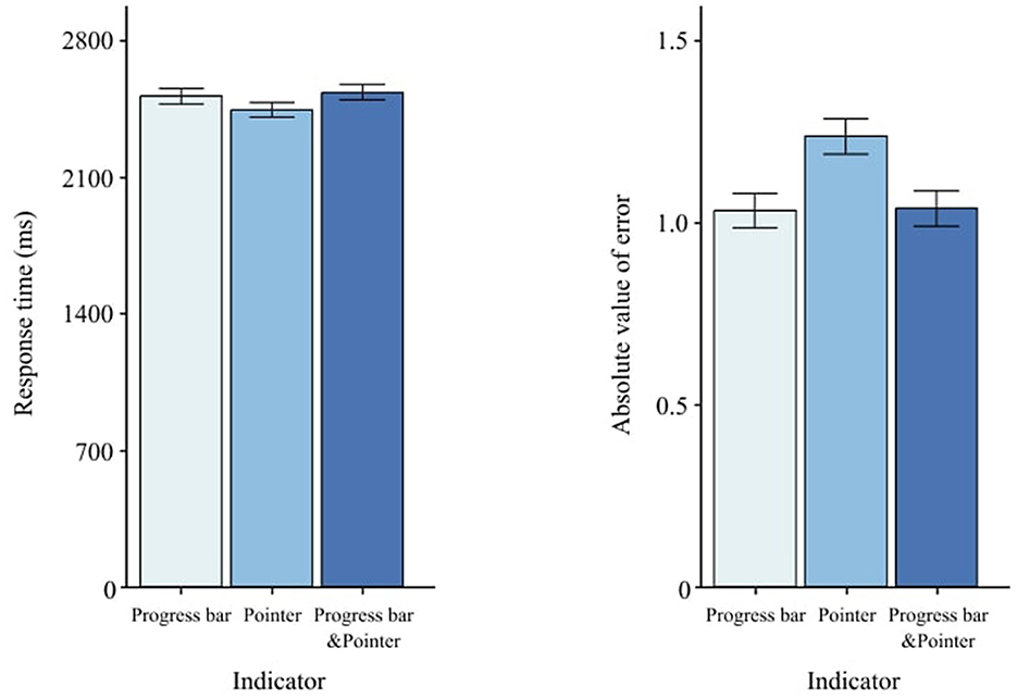 Regarding reaction time, no statistically significant differences emerged between the three types of indicators. Users tended to fixate on the ultimate tick mark where the indicator terminated, a process that may be similarly fast whether the cue was a pointer or a filled progress region. Future eye-tracking studies could offer deeper insights into how these different indicator shapes guide visual search and dwell times.