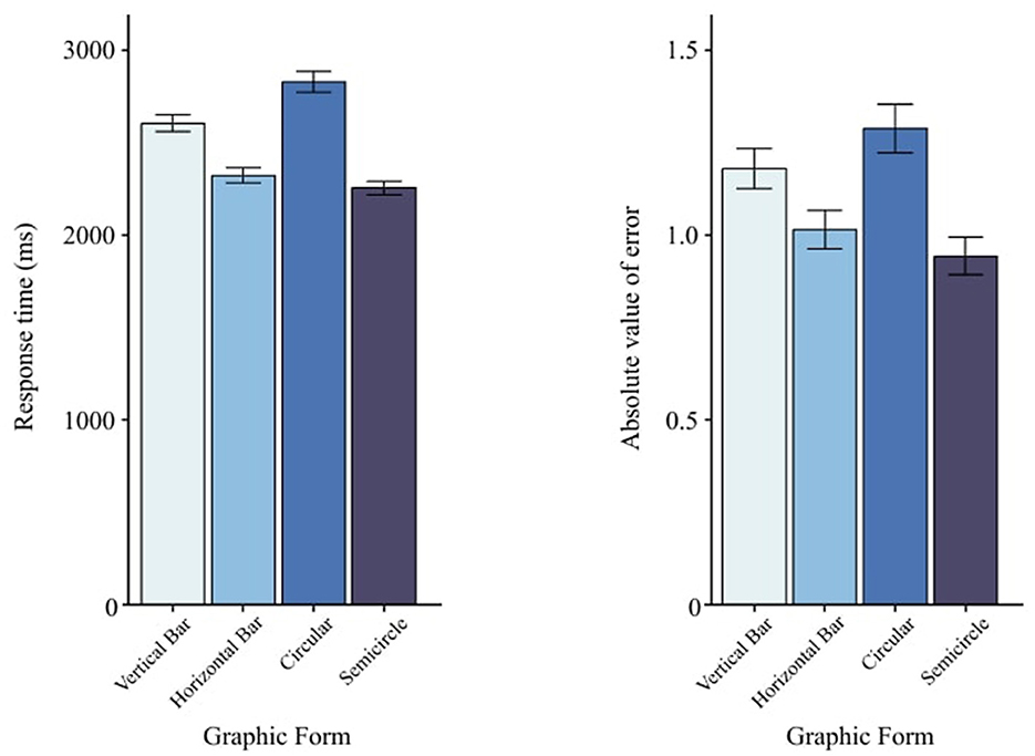 Figure 9. Main effects of graphic form on visual numerical information recognition task. The left panel shows RT, and the right panel shows AE. Error bars indicate ±1 SEs.