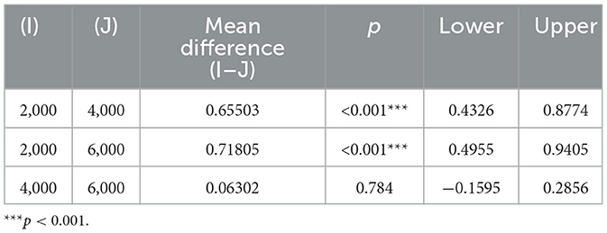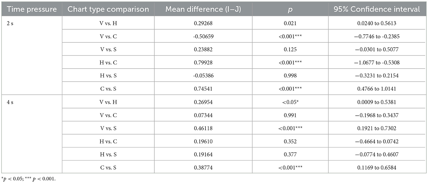 A preliminary study was conducted to determine appropriate time pressure levels. Initially, three levels (2,000 ms, 4,000 ms, and 6,000 ms) were tested with 10 volunteers. The participants interpreted various charts and input values and recorded response times. The results indicated significant effects of time pressure on the response time (F2, 4419 = 35.130, p < 0.001). Table 1 presents the results of the multiple comparisons of Tukey. As response times stabilized beyond 4,000 ms, the 6,000 ms level was discarded, and 2,000 ms and 4,000 ms were chosen for the formal experiment.