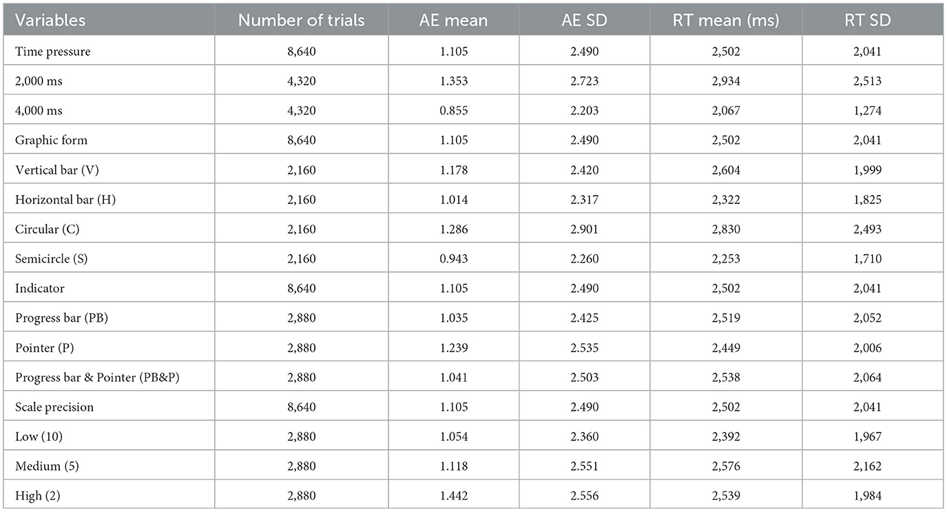 We recorded 8,640 trials. Following the pre-registered exclusion rules—(i) per-participant outlier removal for response time (RT) using a 3 × median absolute deviation (MAD) criterion around each participant's median and (ii) removal of absolute-error (AE) trials ≥25 (miscued key presses)—8,047 trials (93.1%) remained for analysis. All factors were within-subjects in a fully crossed 4 × 2 × 3 × 2 design: Graphic Form (vertical bar, horizontal bar, circular, semicircular), Indicator (pointer vs. progress-bar,+,pointer), Scale Precision (10/5/2 units per tick), and Time Pressure (2 s vs. 4 s). Prior to inferential testing, trial-level observations were aggregated to participant × condition cell means in Table 2.
