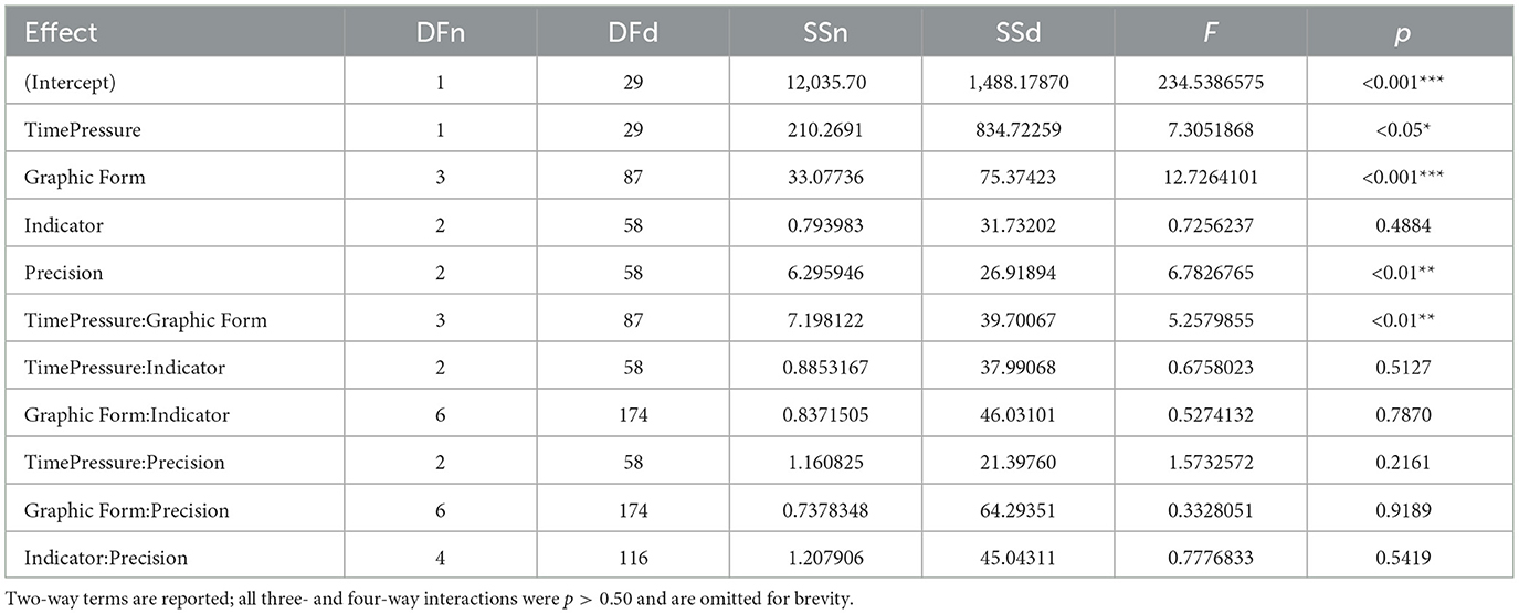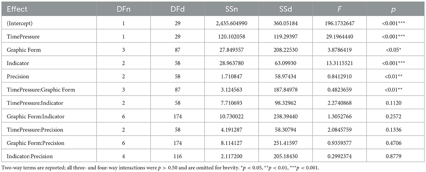 Beyond main effects, the RM-ANOVA for RT (Table 4) revealed a Time Pressure × Graphic Form interaction, F(3, 87) = 5.26, < 0.01 (Figure 10). No other two-way, three-way, or four-way interactions reached significance for RT (all p>0.05), and Indicator type did not affect RT overall, F(2, 58) = 0.73, p = 0.488. For AE (Table 4), no interactions were significant (all p>0.05).