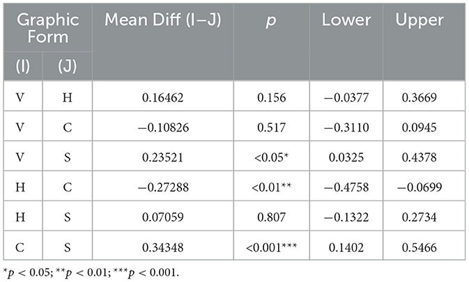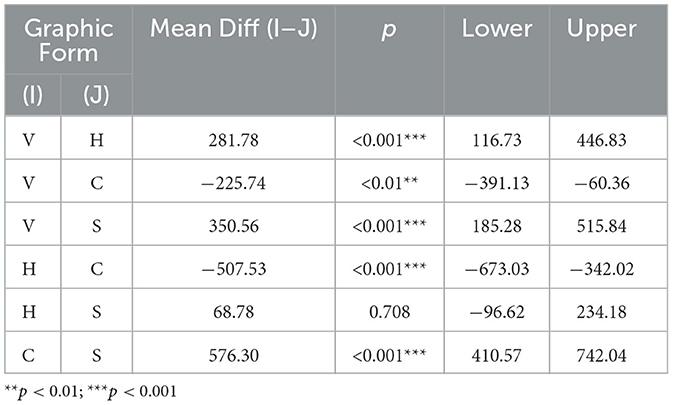 (Table 8) reports Tukey-adjusted pairwise contrasts for Graphic Form within each Time Pressure level (RT; positive differences indicate longer RT for the row form). Under 2s, Circular was reliably slower than Horizontal, Vertical, and Semicircle (all p < 0.001), and Vertical was slower than Horizontal (p = 0.021); contrasts involving Semicircle vs. Horizontal/Vertical were not significant. Under 4s, Semicircle was faster than Vertical (p < 0.001) and Circular (p < 0.001), and Horizontal was faster than Vertical (p < 0.05); other pairs did not differ reliably. This pattern aligns with the Repteated Measure ANOVAs (Tables 3, 4): Graphic Form affected both RT and AE, with Semicircle tending to yield the best performance and Circular the worst. For completeness, Indicator influenced AE but not RT, whereas Scale Precision influenced RT but not AE (Tables 3, 4).