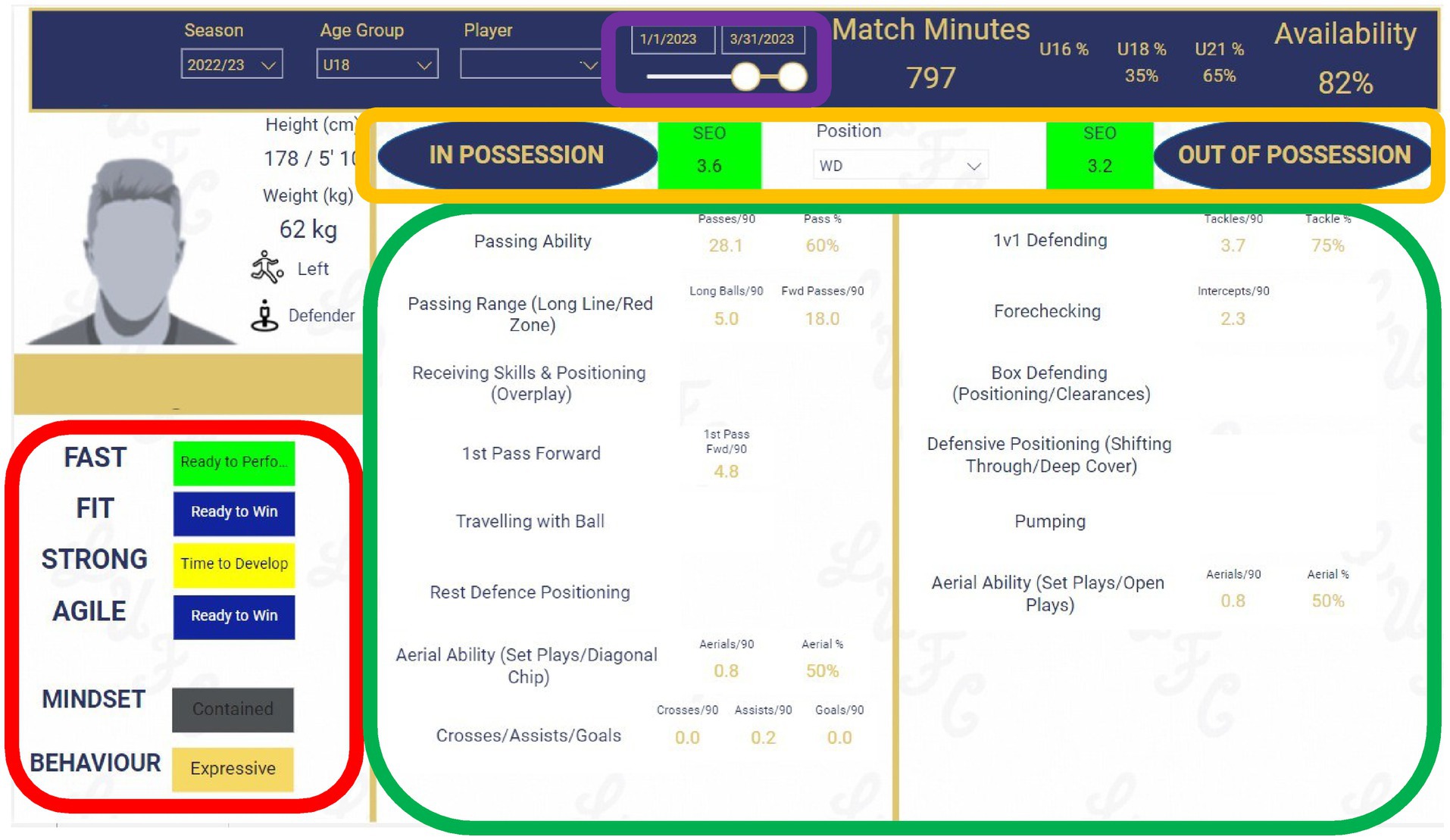 This tool used an interactive format to visualise data from a variety of sources through dashboards and reports (Microsoft Power Bi) and was embedded within the academy’s shared cloud-based, team collaboration platform (Microsoft Teams). This made it easily accessible and interpretable for users and provided them with insights on individual athletes. Figure 1 presents an example report from within the multidisciplinary athlete profiling tool, summarising key information for an individual athlete, which would form the basis of MDT discussions for each athlete. Underpinning attributes deemed important for performance (signs) are highlighted in the red box demonstrating the specific athlete’s physical and psychological profiling data. For the physical profiling, a composite score [Total Score of Athleticism (TSA); Turner et al. (2019)] from physical tests mandated by the elite player performance plan [EPPP; The Premier League (2011)], and with previously proven predictive validity (Murr et al., 2018; Kelly and Williams, 2020), was calculated and a colour coded graded system based on individual growth and maturation was used to represent each athlete. Psychological profiling demonstrated an athlete’s psychological and behavioural adaptability through identifying their personality strengths from a mindset and behavioural perspective. Samples (performance analysis statistics) of performance (across multiple matches) which represent actions from the SMM are highlighted in the green box with the associated score representing the athlete’s mean across the matches for the period chosen. Equally, a mean score for the coach’s SEO of performance across those matches is highlighted in the yellow box. Mean scores were utilised as they represented general performance over multiple matches, discounting possible one-off or atypical performances from individual players. The adjustable date filter highlighted in the purple box provided an adjustable date range permitting variable longitudinal evaluation (e.g., 6-weekly, quarterly, yearly).