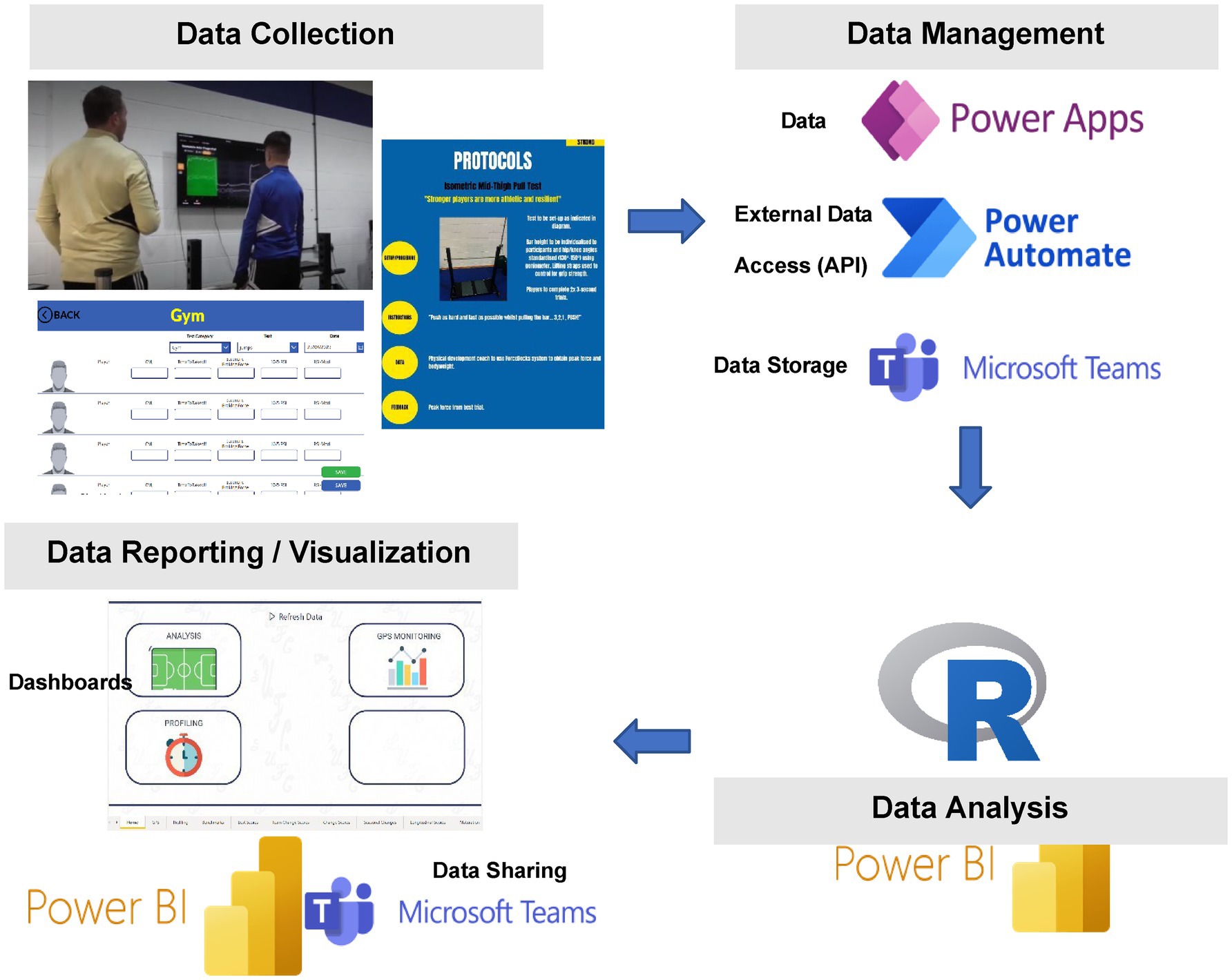 The integration of such software can streamline data management processes through assembling data from a variety of sources, creating relationships between data sources, and forming a relational data model. Use of these software to collect, manage, analyse, and feedback/visualise data allows knowledge to be shared across multiple staff within the organisation. This prompts opportunities for timely and relevant conversations that can act to support the decision-making process regarding an individual athlete’s development. Figure 3 provides a schematic overview of the data processing sequence showing data collection (apps and physical profiling handbook), data management (software used to collect, transform, and store the data), data analysis (software used to clean and analyse the data), data reporting/visualisation (software used to embed the tool within practice).