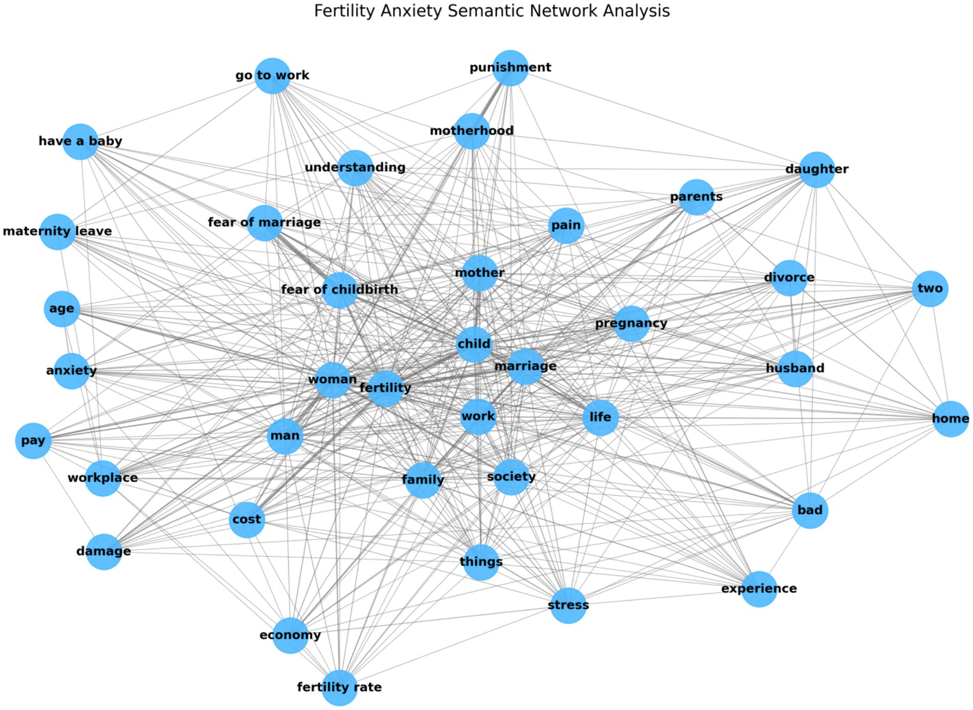 To fill these research gaps, this study conceptualizes “fertility anxiety” and “anti-fertility anxiety” as intertwined and seemingly contradictory dimensions of fertility attitudes, and further situates them within a media psychology framework. From the perspective of media psychology, media are regarded as crucial environments that shape individuals’ cognition, emotions, and behaviors (Fischer et al., 2011), particularly through psychological mechanisms such as social identity (Tajfel and Turner, 2004), social norms (Rodrigues et al., 2022), emotional contagion (Ferrara and Yang, 2015), and polarization (Iyengar et al., 2012). Social media are not only platforms for disseminating fertility-related information but also important psychological contexts where women experience intensified anxiety and engage in resistance through both cognition and emotion. Within this theoretical framework, fertility anxiety and anti-fertility anxiety can be understood as complex psychological effects jointly shaped by multiple mechanisms. Employing a mixed-methods approach, this study integrates grounded theory with natural language processing (NLP) techniques—including semantic network analysis and sentiment analysis—to examine how women construct and articulate reproductive attitudes on social media and uncover the socio-psychological processes behind these expressions. Four research questions are presented as follows:
