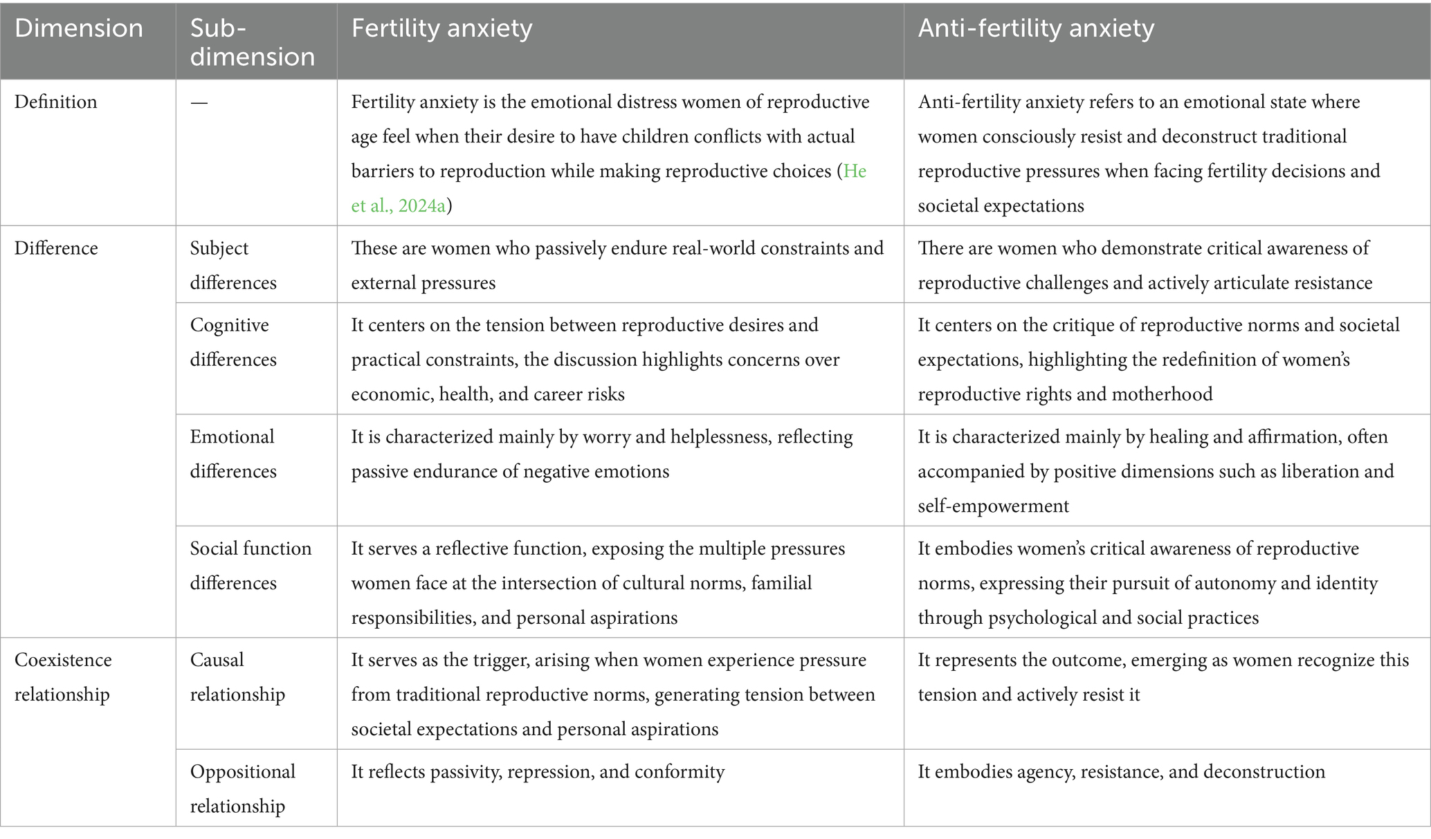 The aforementioned studies indicate that feminist values not only reshape societal understandings of reproduction but also provide critical resources and strategic frameworks for women coping with fertility-related anxiety. Building on this foundation, we introduce the core concept of anti-fertility anxiety and clarify its relationship to fertility anxiety. Anti-fertility anxiety refers to an emotional state in which women consciously resist and deconstruct traditional reproductive pressures when faced with fertility decisions and societal expectations. It is not merely the inverse of fertility anxiety but rather a critical emotional mechanism that differs in terms of subjectivity, cognition, emotion, and social function. Both anxieties often coexist in social media, sometimes within the same discourse. Indeed, fertility anxiety often catalyzes anti-fertility anxiety: when women recognize the constraints of fertility anxiety, they respond with acts of resistance and deconstruction. Fertility anxiety is characterized by repression and distress, whereas anti-fertility anxiety embodies critique and resistance—two states that are interrelated yet oppositional. The detailed comparison of the two can be seen in Table 1.