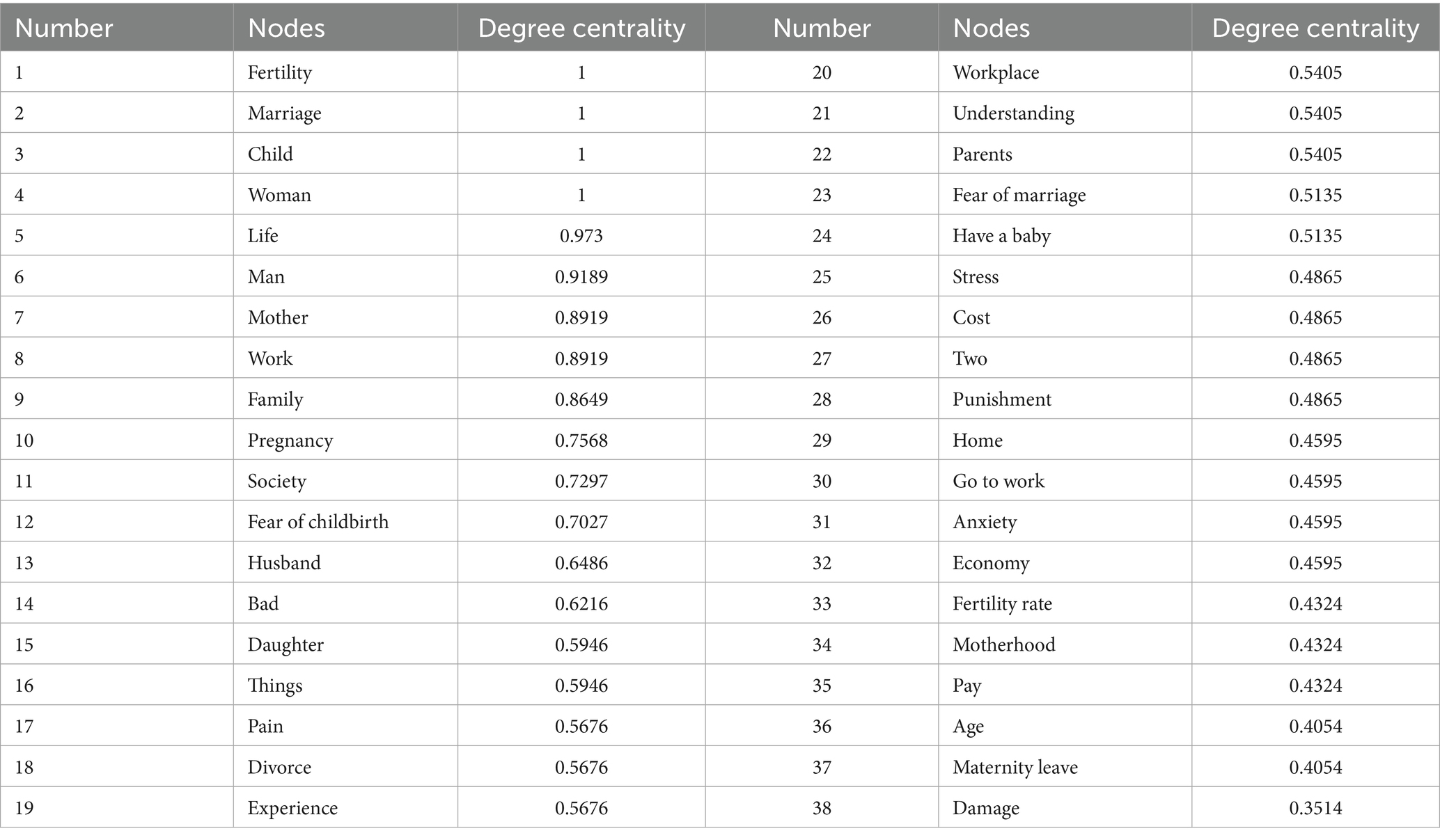 In the second phase, we constructed semantic networks to explore the central semantic structures of fertility anxiety and anti-fertility anxiety. The analysis involved the following key steps. First, we preprocessed the text using the Jieba word segmentation tool in the Python environment and eliminated stopwords with the extended Harbin Institute of Technology’s stopword dictionary. Next, we computed the word frequencies and applied Sun et al. (1999) dynamic high-frequency word formula to determine the dynamic threshold T, as follows: