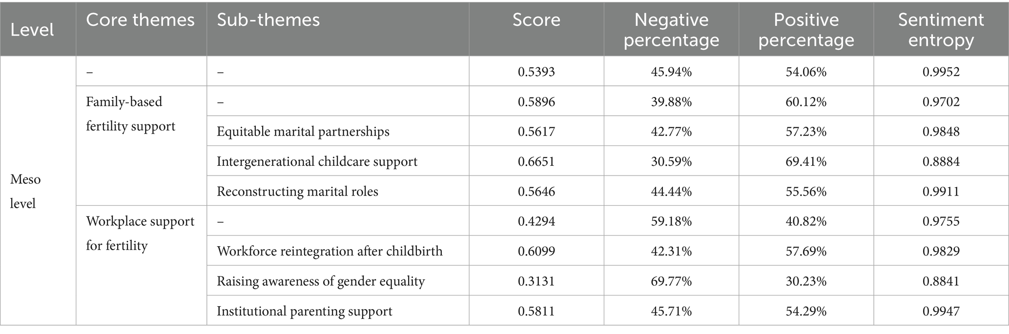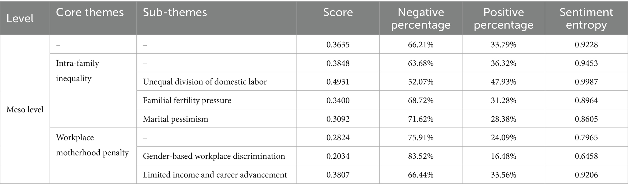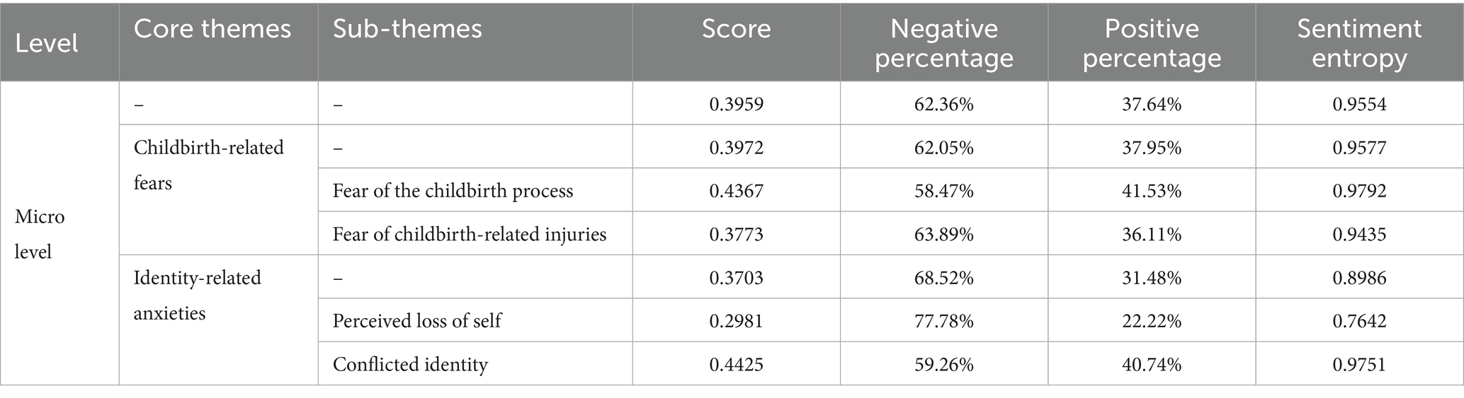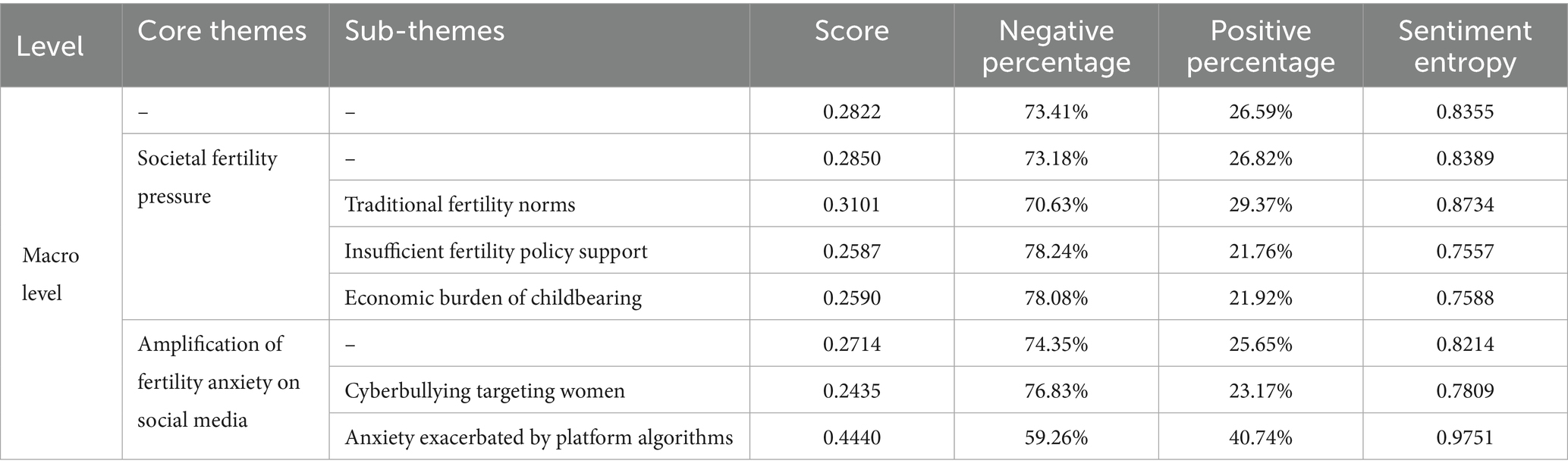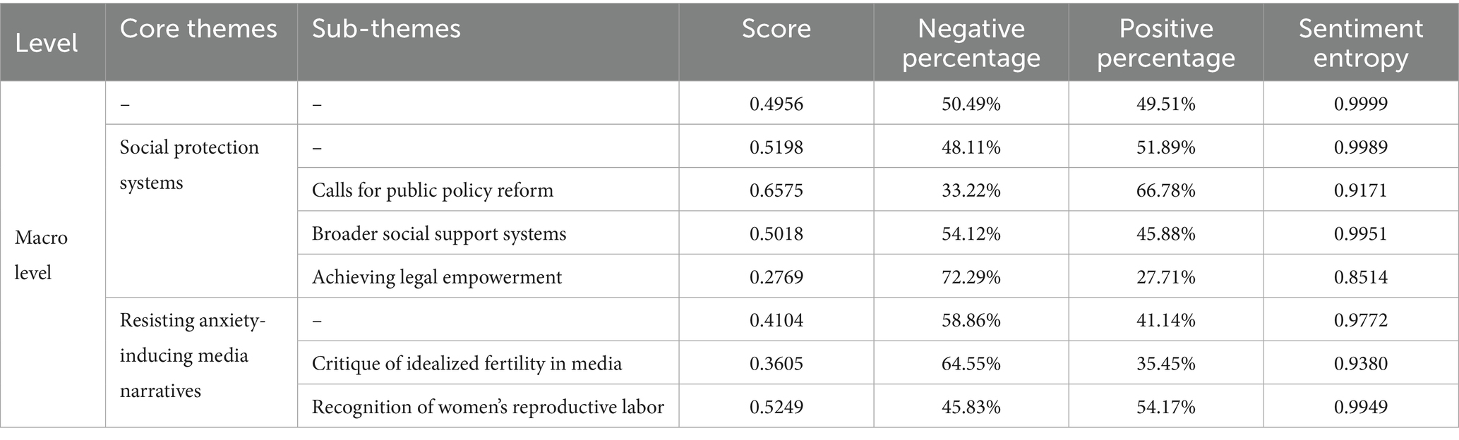 Results: The findings indicate that both fertility anxiety and anti-fertility anxiety are shaped by sociocultural and media narratives at the macro level, family and workplace dynamics at the meso level, and personal values and experiences at the micro level. Fertility anxiety discourse is primarily situated at the macro and meso levels, reflecting women’s feelings of insecurity and powerlessness in the face of societal pressures, maternal penalties and unequal family burdens. Anti-fertility anxiety is more rooted in micro-level expression, emphasizing reproductive autonomy and identification with motherhood amid a broader feminist awakening. The emotional tendency of fertility anxiety is predominantly negative, with intensity decreasing from the macro to the meso and micro levels. Anti-fertility anxiety is associated with more positive emotions, with emotional intensity declining from the micro to the meso and macro levels.
