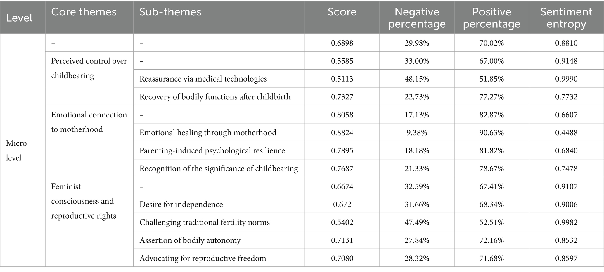 Based on grounded theory, women’s anti-fertility anxiety can be categorized into seven main themes and 20 sub-themes, organized across three levels: micro, meso, and macro (see Figure 3). At the micro level, a sense of control over childbearing, emotional identification with motherhood, and the defense of reproductive rights constitute internal coping mechanisms. At the meso level, supportive workplace and family environments help alleviate work–family conflict. At the macro level, improvements in social security systems and resistance to anxiety-inducing media narratives further alleviate reproductive anxiety. Together, these multi-level strategies form the core framework through which women resist fertility anxiety and lay the foundation for more autonomous, rational, and sustainable reproductive choices. Details of the coding and reference sentences can be found in Supplementary data S2.