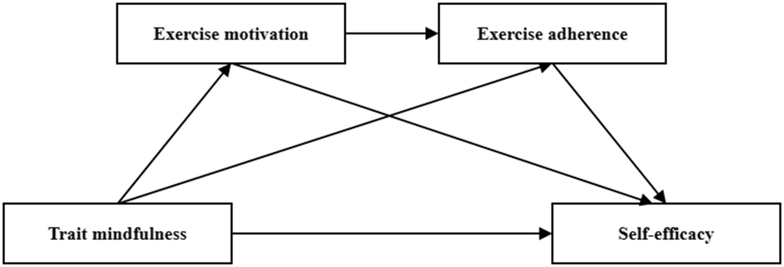 However, intention or motivation alone is often insufficient for behavior maintenance. The Health Action Process Approach (HAPA) underscores the need for volitional processes such as action planning, behavioral regulation, and adherence to bridge the gap between motivation and sustained physical activity (Schwarzer, 2016). Exercise adherence, defined as the ability to maintain regular physical activity over time despite obstacles, emerges as a critical mediating factor in this regard (Mcauley and Courneya, 1993). Empirical findings show that mindfulness facilitates adherence by fostering acceptance of discomfort, enhancing cognitive flexibility, and strengthening regulatory endurance (Lindsay et al., 2018). These factors are essential for sustaining long-term health behavior in the absence of external incentives. Moreover, the positive feedback generated by continued exercise further reinforces self-efficacy, particularly in populations that previously lacked such mastery experiences (Rodrigues et al., 2023; Wuepper and Lybbert, 2017). Therefore, we hypothesize Hypothesis 3 (H3): Exercise adherence mediates the relationship between exercise motivation and self-efficacy.
