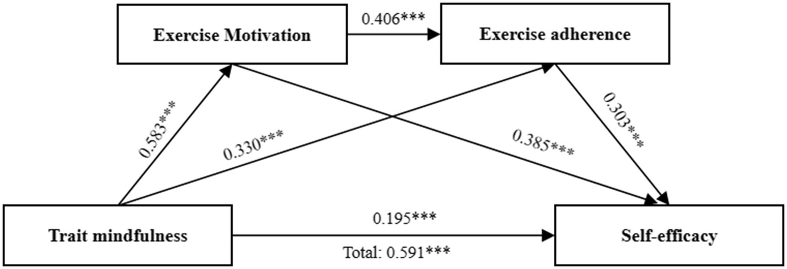 The regression analysis results (Table 3) reveal that trait mindfulness positively predicts self-efficacy among sports-disadvantaged college students (β = 0.591, p < 0.001), confirming hypothesis H1. When mediating variables are introduced, the direct effect of trait mindfulness on participants’ self-efficacy diminishes (β = 0.195, p < 0.001), while trait mindfulness significantly predicts both exercise motivation (β = 0.583, p < 0.001) and exercise adherence (β = 0.330, p < 0.001). Additionally, exercise motivation significantly predicts exercise adherence (β = 0.406, p < 0.001) and self-efficacy (β = 0.385, p < 0.001), and exercise adherence significantly predicts self-efficacy (β = 0.303, p < 0.001). These findings suggest that exercise motivation and adherence act as mediators, forming a chain of mediation in the influence of trait mindfulness on self-efficacy in this group.