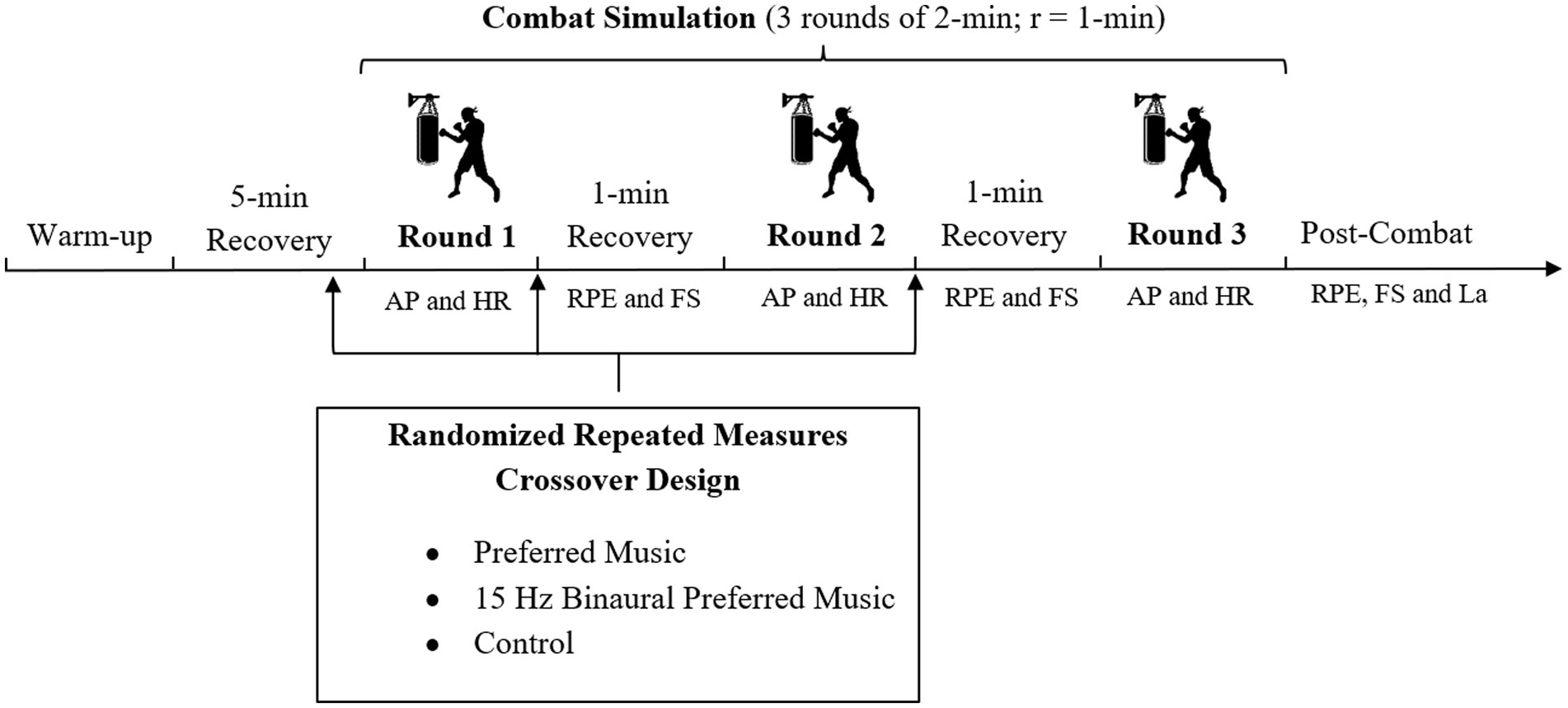 Flowchart illustrating a combat simulation with three two-minute rounds and one-minute recoveries. Pre-combat involves warm-up and five-minute recovery. Post-combat measures include RPE, FS, and La. Measurements like AP and HR are taken after each round. A randomized repeated measures crossover design includes preferred music, fifteen hertz binaural preferred music, and no music conditions.