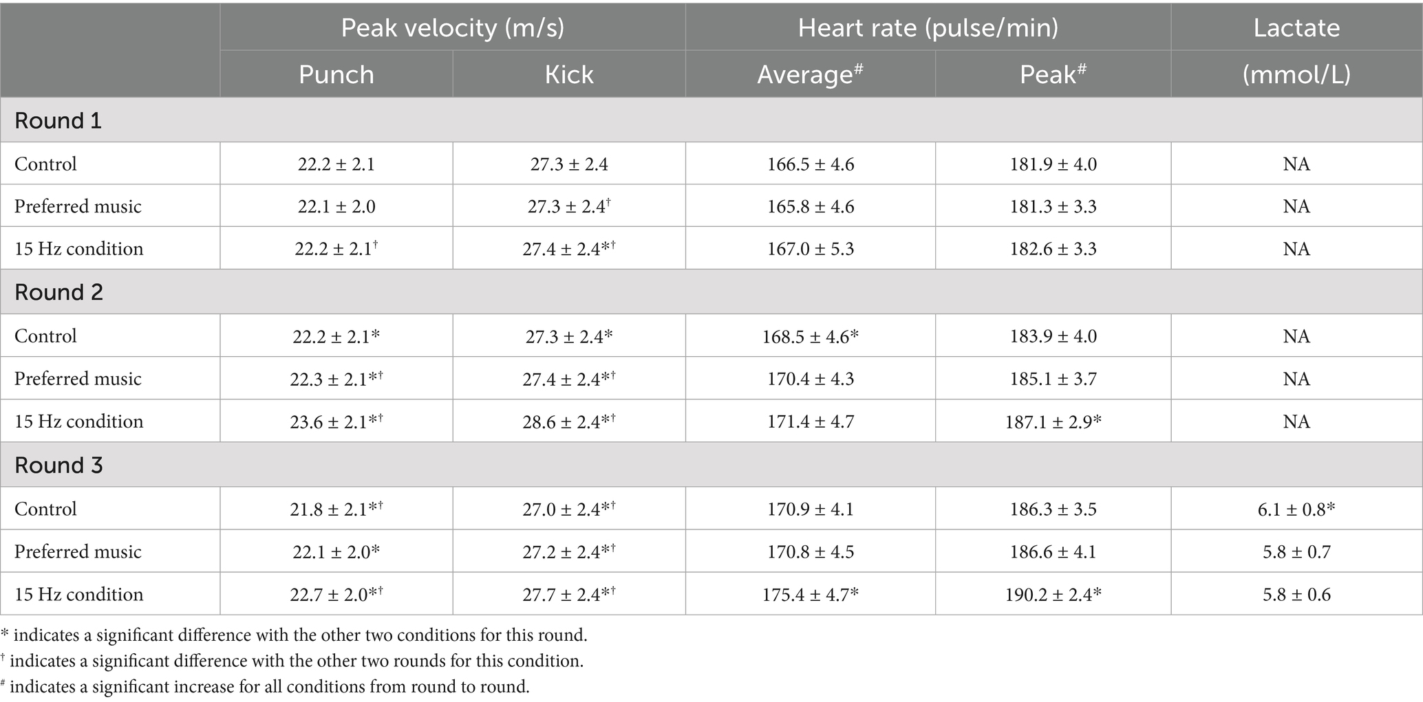 Physical performance parameters demonstrated significant condition, round, and interaction effects (F ≥ 9.1, p ≤ 0.001, ηp2 ≥ 0.33). Post-hoc analysis revealed 0.3–0.5 mmol/L higher lactate concentrations in the control condition compared to music interventions (Cohen’s d = 0.6–0.8), indicating practically meaningful differences in metabolic demand. Peak punch and kick velocity had a different development over the three rounds between the three conditions. So did the control condition decreased impact velocity in round three compared to the other two rounds, while in the preferred music and 15 Hz-BPM conditions it first increased from the first to the second round and decreased again from the second to the third round, while this decrease was significantly less for the 15 Hz-BPM condition compared with the preferred music condition. Average and peak heart rate increased for all conditions from round to round. However, in the 15 Hz-BPM the mean and peak heart rates increased more than in the other conditions (see Table 1).