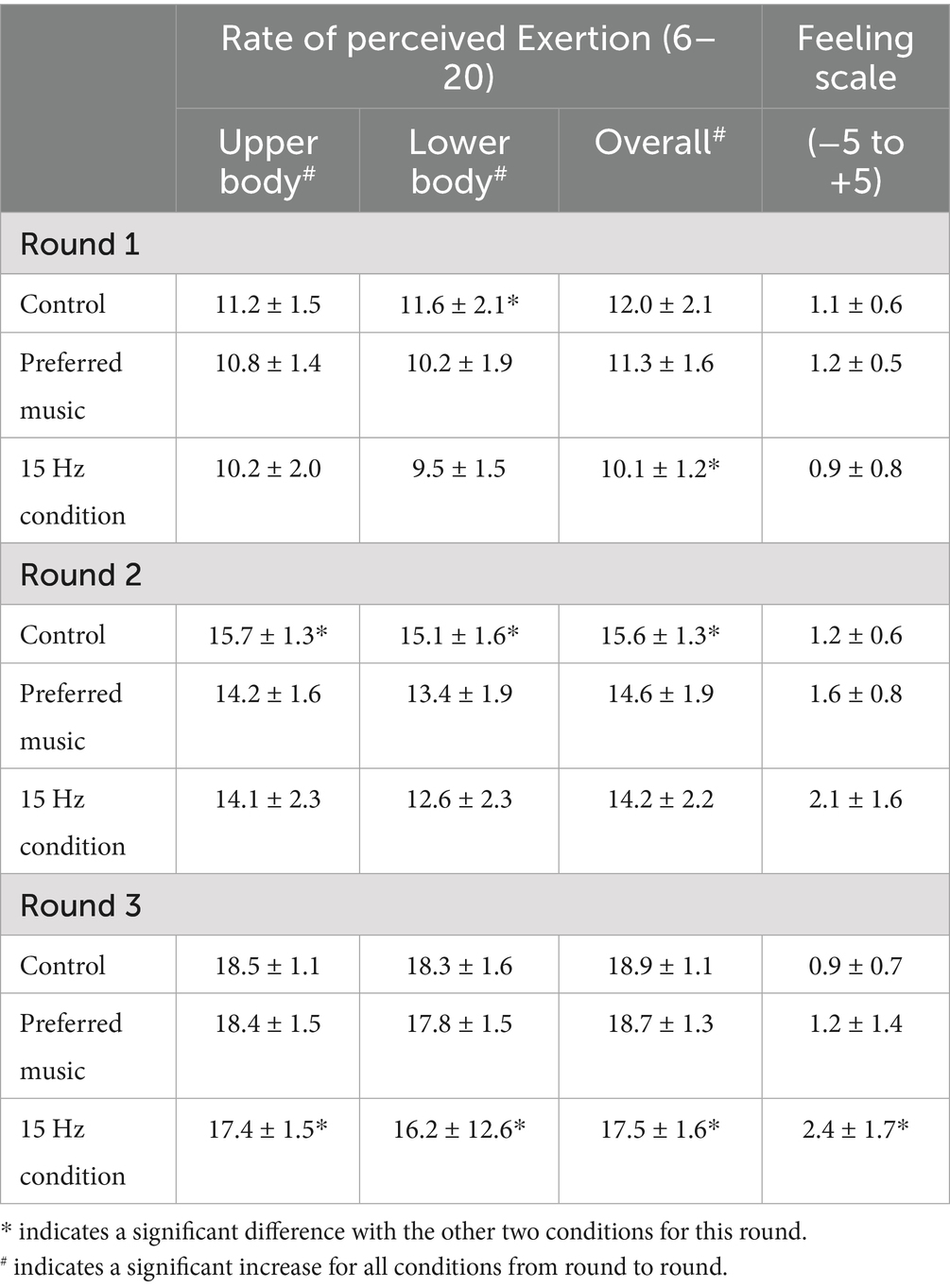 The psychological parameters were also all significantly affected by rounds and condition (F ≥ 4.0, p ≤ 0.027, ηp2 ≥ 0.18), while only a significant interaction effect was found for feeling and upper body RPE (F ≥ 4.1, p ≤ 0.005, ηp2 ≥ 0.19). Post-hoc analysis revealed progressive RPE increases across rounds, with the 15 Hz-BPM condition demonstrating 1.1–1.4-point reductions compared to control in round 3. These differences exceed the minimal clinically important difference of 1.0 point established for RPE scales in exercise research, indicating practically meaningful reductions in perceived exertion. For the feeling grade in increase from round 1 to 2 was found (but not significant per condition), while in round three the feeling grade was significantly higher in the 15 Hz preferred condition compared to the other two conditions (see Table 2).