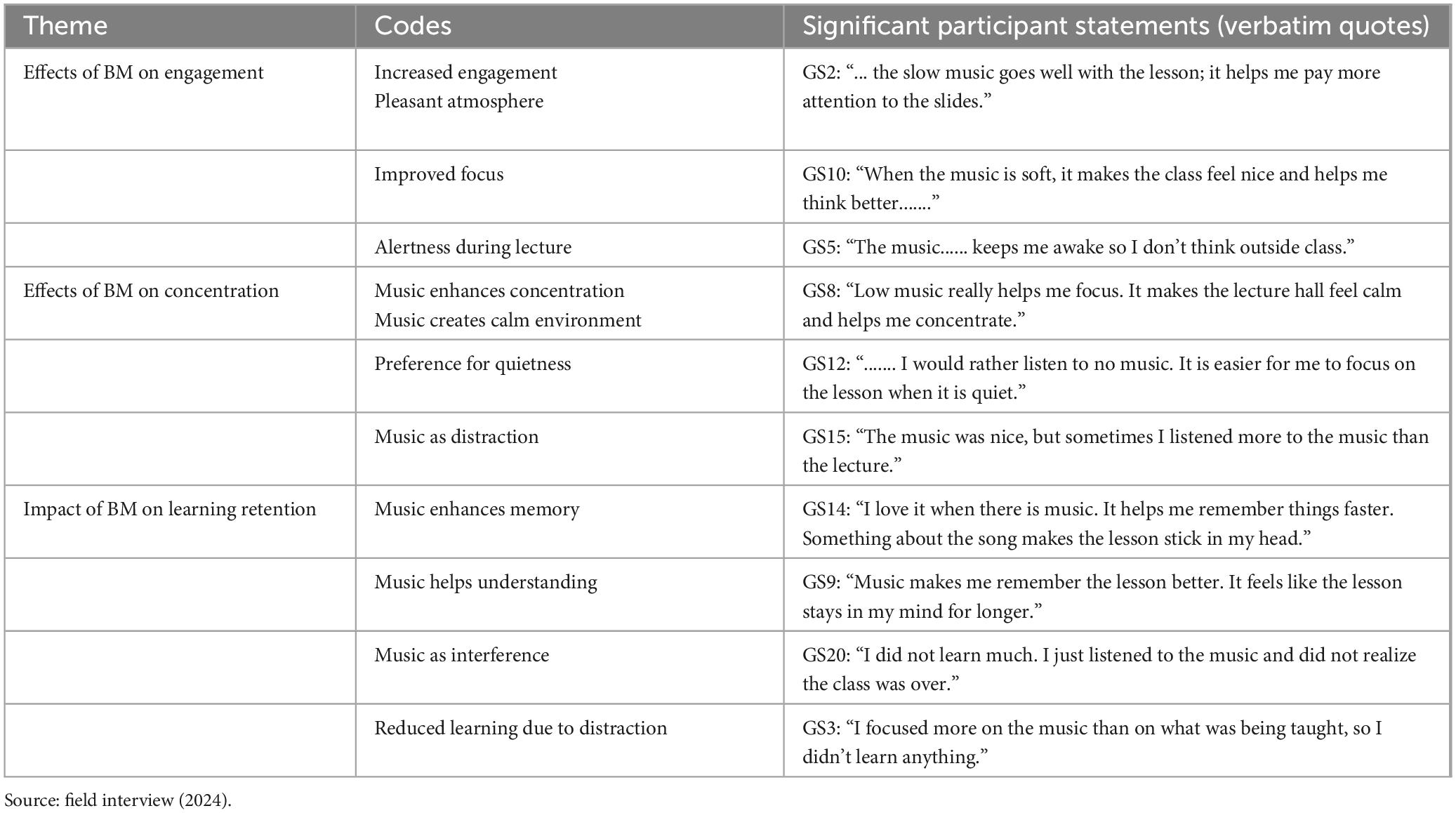 After conducting interviews with 23 students, it was found that BM has effects that can be related around three key themes that emerged during the thematic analysis (Table 1). According to Table 1, BM has effects on staying engaged, concentrating, and retention in learning. These themes were used in the discussion to better understand the different ways students experienced the effects of BM during their lectures. Below the table is a more detailed look at each theme, supported by direct quotes from the participants.