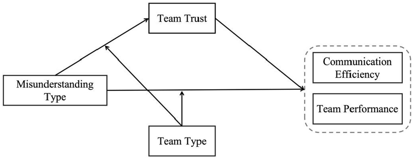 Team trust plays a pivotal role in human–AI collaboration, shaping members’ acceptance of AI, willingness to cooperate, and task allocation strategies (McGrath et al., 2025; Dennis et al., 2023). Trust among team members facilitates information sharing and collaborative intent (Imam and Zaheer, 2021) and serves as a buffer against the negative consequences of poor communication (Bahrain et al., 2023). Misunderstandings, however, can undermine trust development within teams. Specifically, information omissions are typically more transparent and easily corrected, thus having a limited impact on trust. In contrast, ambiguous expressions may lead to doubts about the competence or intentions of others—including AI systems—due to their covert nature and interpretive complexity (Schaefer et al., 2017). In human–AI teams, ambiguous misunderstandings further intensify trust challenges between humans and AI, thereby hampering communication and collaboration (Park, 2025). As AI continues to be embedded in team workflows, trust mechanisms become increasingly critical. Studies show that trust in AI directly affects the degree to which its suggestions are accepted and integrated into team decisions (Bedué and Fritzsche, 2022). Moreover, misunderstanding types influence not only interpersonal trust but also trust in AI agents (Li et al., 2024), which subsequently affects communication efficiency and performance. However, empirical models clarifying how different misunderstanding types influence outcomes through trust are still scarce.