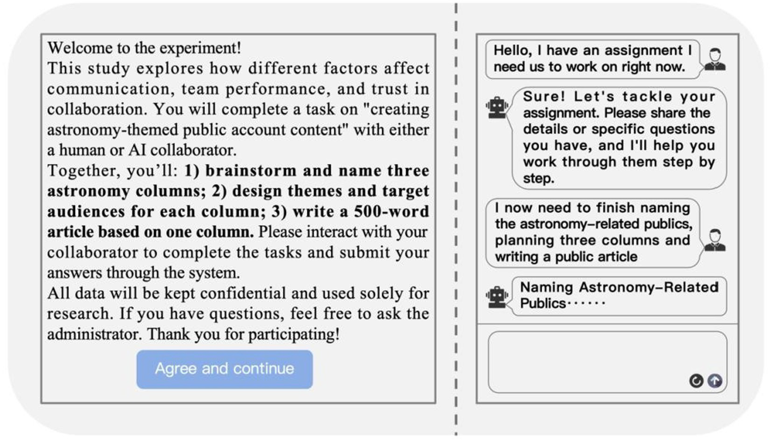 This study employed a 2 (team type: human–AI vs. human–human, between-subjects) × 2 (misunderstanding type: information omission vs. ambiguous expression, within-subjects) mixed factorial design to systematically examine the effects of misunderstanding types and partner attributes on communication efficiency, team performance, and team trust. The core task involved cocreating content for a popular science WeChat public account focused on astronomy, a scenario chosen for its creativity, collaborative nature, and ecological validity. The task was pretested and validated for comprehension among the target population. Each dyad was required to complete three subtasks: (1) generate and name three column titles for astronomy-related science content, (2) design a theme and target audience for each column, and (3) collaboratively write a 500-word article for one selected column.