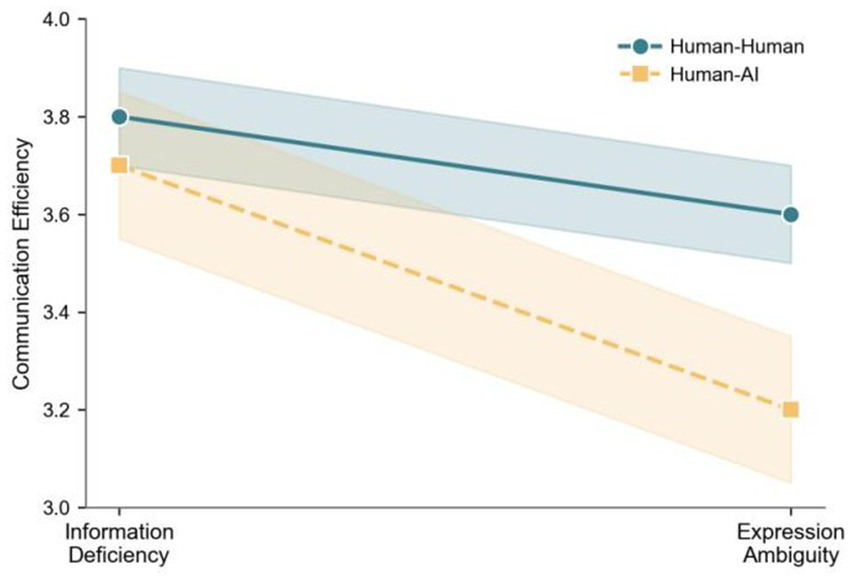 The peer type refers to the nature of the interaction partner in a team—human peer versus AI peer—and has been shown to significantly affect team communication and collaboration outcomes (Myers et al., 2010). In human–human teams, shared social norms and past experiences help members efficiently identify and resolve information omissions, thereby mitigating their negative impact on communication (Henningsen and Henningsen, 2007). In human–AI teams, members typically have lower social expectations for AI peers and tend to adapt by taking the initiative to clarify or fill in missing information (Siemon, 2022). However, when dealing with ambiguous expressions, AI’s limitations in understanding unstructured or nuanced input become more apparent (Mahadevkar et al., 2024). In such cases, team members are more likely to attribute communication failure to the cognitive limitations of AI, leading to attributional bias. This bias not only reduces communication efficiency but also undermines trust (Schwartz et al., 2022). In virtual or human–AI teams, the negative effects of ambiguous misunderstandings on trust and performance are particularly pronounced. Moreover, trust in AI is especially vulnerable to ambiguity-induced miscommunication, which subsequently impairs cooperation and performance. Thus, we propose the following hypotheses: