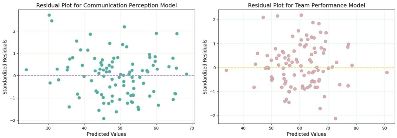 Control variables, specifically Cognitive Reflection Test (CRT) and Multidimensional AI Literacy Scale (MAILS), were measured to account for participants’ cognitive style and AI-related knowledge. As shown in Table 2, although these variables were not included in the main regression models due to their nonsignificant associations with key outcomes, the regression coefficients for CRT and MAILS predicting communication perception (β = 0.049, p = 0.236; β = 0.056, p = 0.143), team performance (β = 0.037, p = 0.432; β = 0.062, p = 0.140), and team trust (β = 0.058, p = 0.138; β = 0.044, p = 0.237) were all small and nonsignificant. Sensitivity analyses further confirmed that including CRT and MAILS in the regression models did not substantially alter the main effects or model fit (ΔR2 < 0.01, all main predictors remained significant). This approach minimizes concerns about omitted variable bias and reinforces the robustness of the analytic strategy (Figure 2).