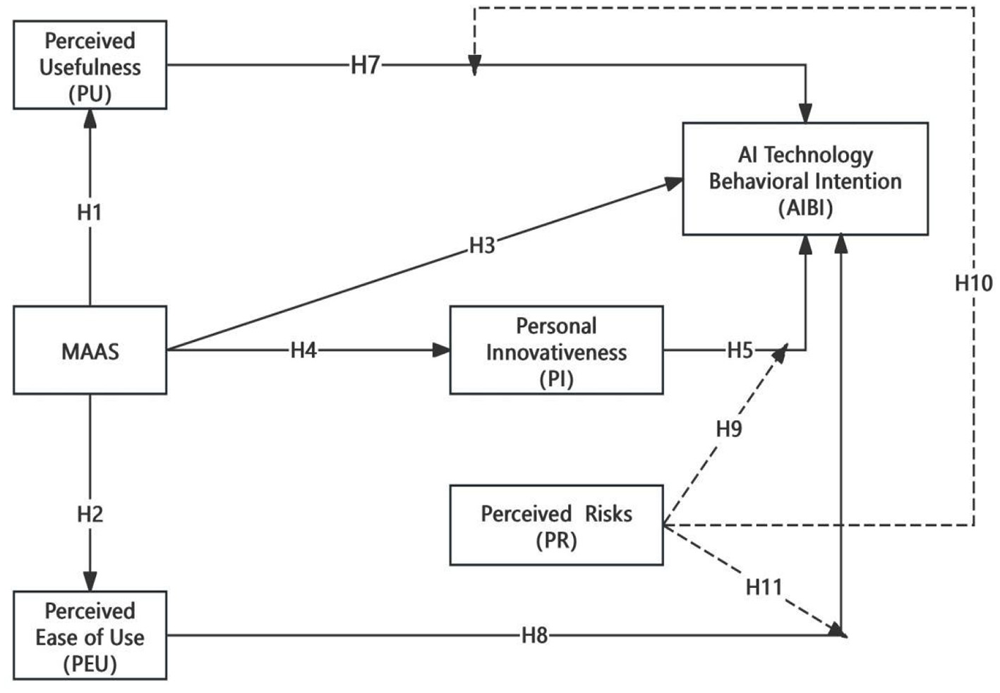 Students' use of AI technology in educational settings is both challenging and risky (Teo et al., 2011). (Wamsler and Brink 2018) demonstrate that in higher education, students with higher levels of mindfulness are more likely to enhance their PU and PEU of new technology, ultimately increasing their actual willingness to use it (Jang et al., 2021). Recently, Long et al. (2025) found that students who engage in mindfulness training can overcome negative emotions, gain a deeper self-understanding, and improve both PU and PEU. Based on these findings, this study proposes the following research hypothesis:
