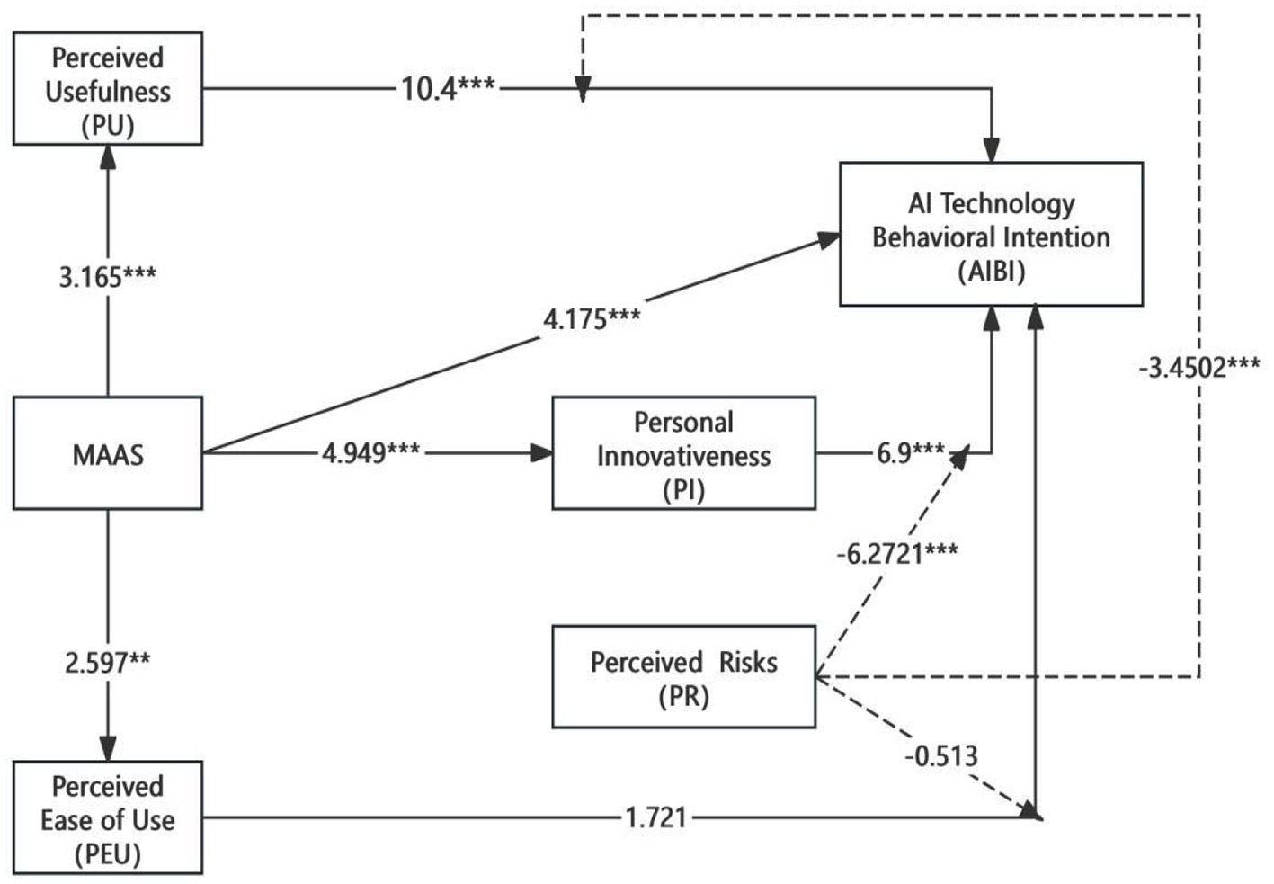 The findings revealed three key outcomes. First, mindfulness exerts a significant, direct, and positive influence on personal innovativeness (PI), perceived usefulness (PU), and perceived ease of use (PEU). Second, PI functions as a mediating variable in the relationship between mindfulness and AI-based behavioral intention (AIBI). Third, perceived risk (PR) significantly weakens the relationships between PI, PU, and AIBI.
