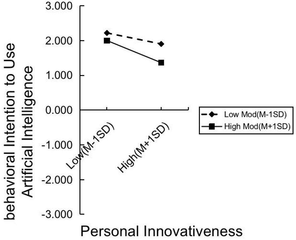 Hypothesis 9: Perceived risk negatively moderates the effect of personal innovativeness on media students' behavioral intention to use AI technology.