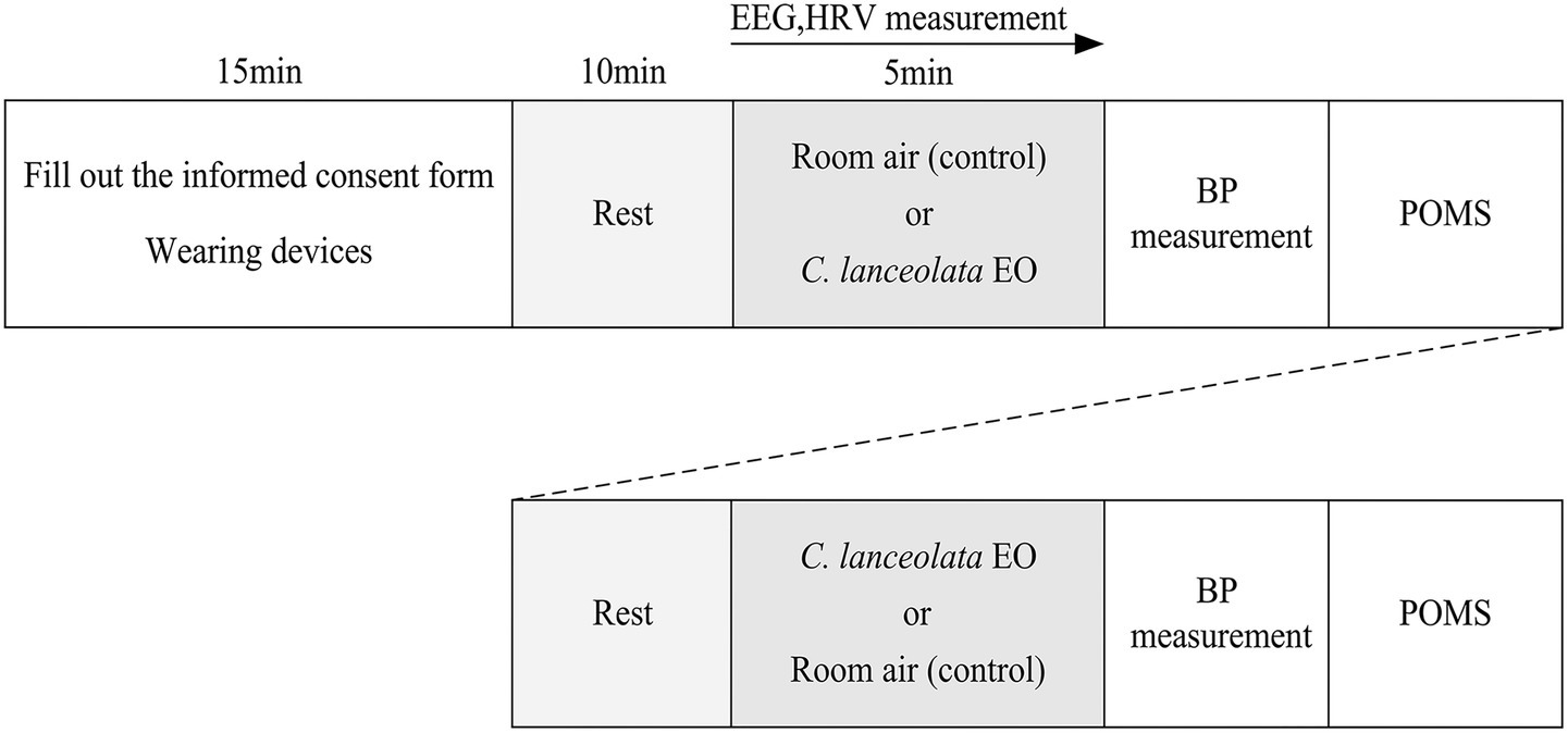 After entering the experimental environment, the subjects were informed of the experimental procedures and purpose. They filled out and signed the informed consent form, and the experimenters assisted them in wearing the physiological monitoring equipment, which took about 15 min. Then, the subjects were given 10 min to rest and adapt to reach a stable physiological and psychological state. After resting, the subjects inhaled either room air or C. lanceolata EO for 5 min. Then, after another 10 min of rest, they inhaled the other odor. While inhaling the gas, their physiological data, such as Electroencephalograms (EEG) and HRV were continuously collected. After inhaling each gas, BP data were immediately collected and subjects completed the POMS psychological questionnaire shortly thereafter. After the experiment, the physiological monitoring equipment was removed, and the entire experimental session lasted about 60 min.