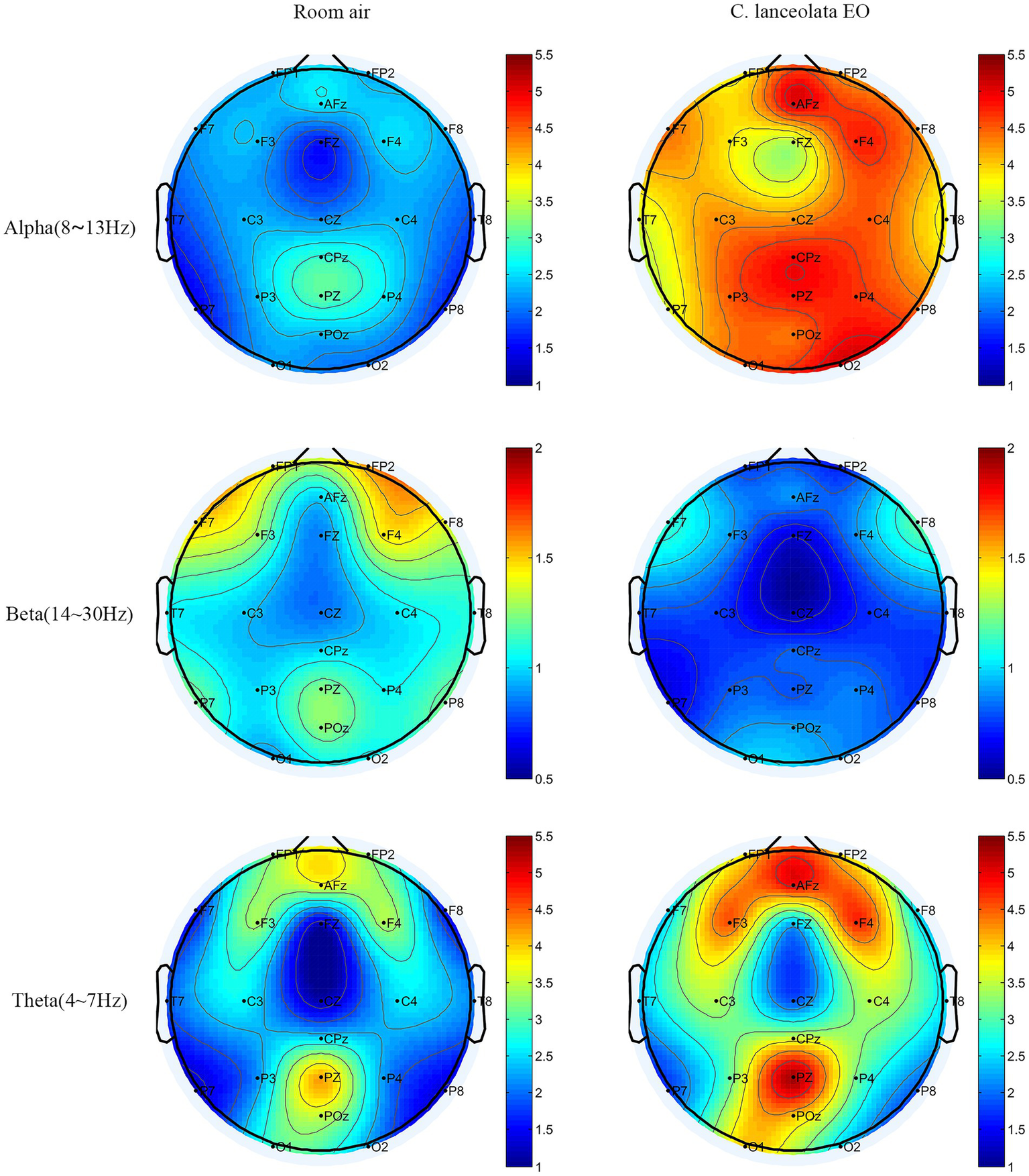 3.1.1 Comparison of differences in EEG topography maps during inhalation of room air (control) and C. lanceolata EO