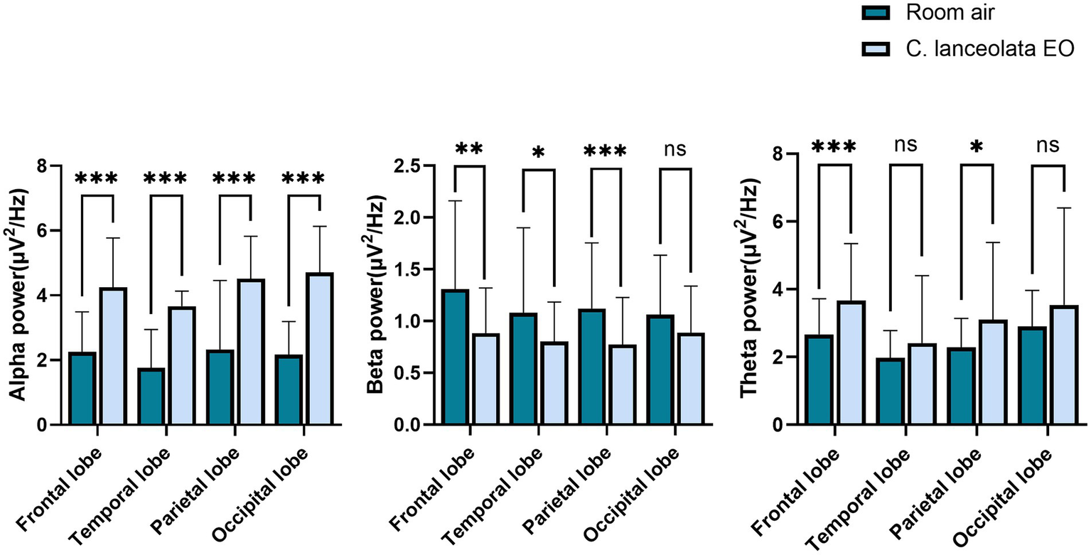 Air, room air; EO, C. lanceolata EO; FL, frontal lobe; TL, temporal lobe; PL, parietal lobe; OL, occipital lobe. N = 40; values are represented as mean ± SD. Significant differences: ns (not significant); *p < 0.05; **p < 0.01; ***p < 0.001.