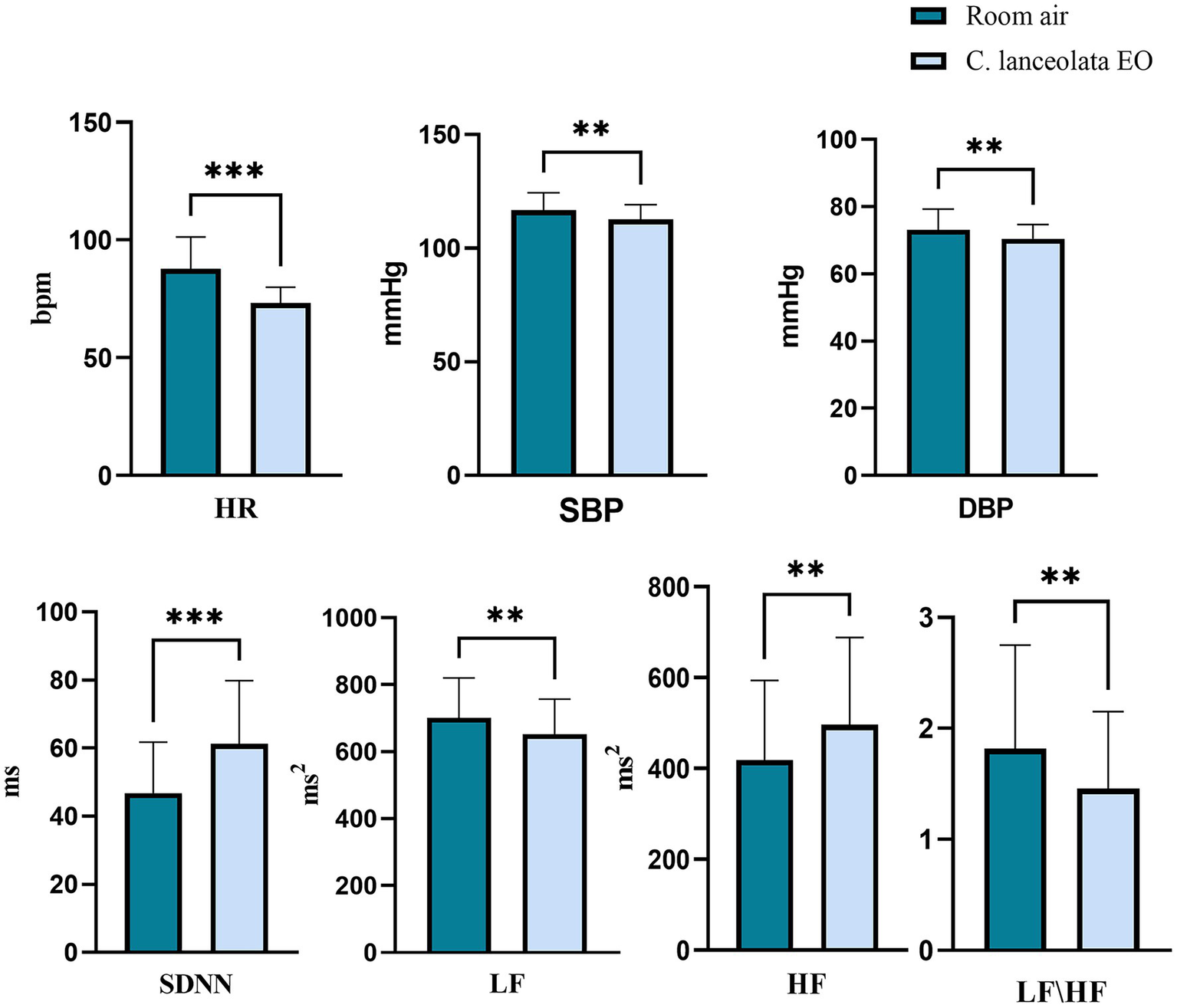 Paired-samples t-tests were conducted to evaluate significant differences in HRV and BP during inhalation of room air (control) versus C. lanceolata EO (Figure 5), with results summarized in Table 3. This analysis evaluated statistically significant differences between mean HR, SDNN, LF, HF, and LF/HF ratio during room air (control) inhalation versus C. lanceolata EO inhalation. The results showed that stress indicators during inhalation of C. lanceolata EO were significantly lower than those during inhalation of room air (control), while indicators related to relaxation were significantly higher. Specifically, compared with inhalation of room air (control), under the C. lanceolata EO inhalation condition, the HR of the subjects was significantly lower by 14.47 beats/min (p < 0.001). The mean SDNN was significantly higher by 14.48 ms (p < 0.001), the mean LF was significantly lower by 47.86 ms2 (p < 0.01), the mean HF was significantly higher by 78.05 ms2 (p < 0.01), and the mean LF/HF was significantly lower by 0.36 (p < 0.01). Additionally, the mean SBP was significantly lower by 4.0 mmHg (p < 0.01), and the mean DBP was significantly lower by 2.7 mmHg (p < 0.01). These results suggest that inhaling C. lanceolata EO can significantly improve heart rate variability and increase parasympathetic nerve activity while reducing sympathetic nerve activity.