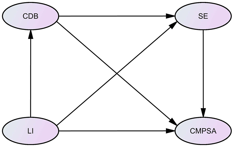 The following hypotheses are proposed for this study. The first hypothesis (H1) posits that LI significantly and positively predicts CMPSA. The second hypothesis (H2) suggests that CDB and SE have parallel mediating effects between LI and CMPSA. The third hypothesis (H3) states that CDB and SE have chain mediating effects between LI and CMPSA. The fourth hypothesis (H4) emphasizes that there are significant regional differences in the mechanisms of CMPSA. The hypothetical model based on the above research hypotheses is shown in Figure 1.