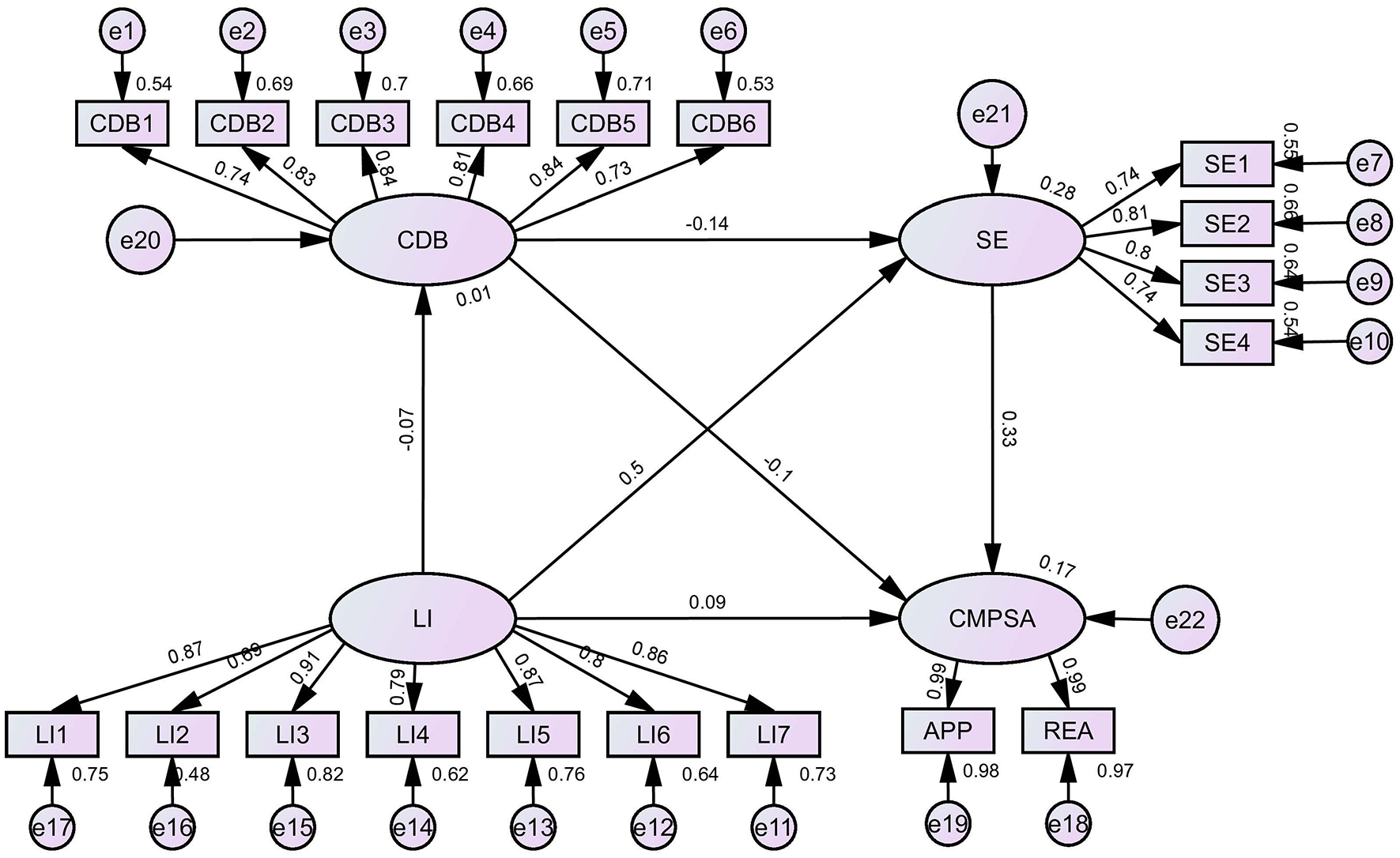 To investigate the underlying mechanisms, the Pearson correlations between LI, CDB, SE, and CMPSA were further examined. The analysis results, as presented in Table 2, reveal significant correlations among all four variables. To be specific, LI and SE are significantly and positively correlated with CMPSA (r = 0.240, 0.364), indicating that higher levels of LI and SE are associated with stronger CMPSA. Meanwhile, CDB is significantly and negatively correlated with SE (r = −0.158) and CMPSA (r = −0.159), suggesting that CDB can undermine students' SE and CMPSA. Additionally, a significant positive correlation exists between LI and SE (r = 0.440). These findings suggest that enhancing students' LI and SE and reducing CDB can contribute to improving their CMPSA.